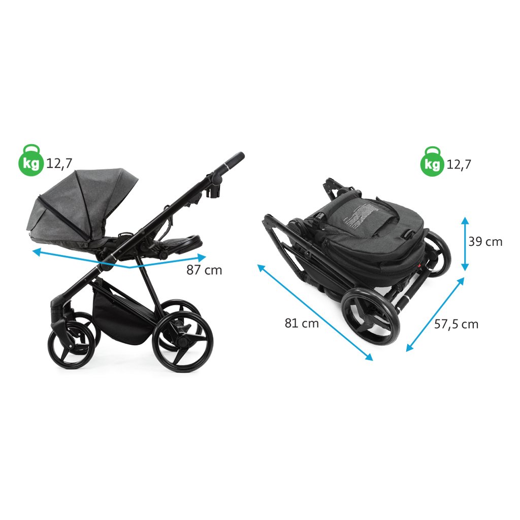 - rozmery zloženého kočíka: 81 x 57,5 x 39 cm (D x Š x V)