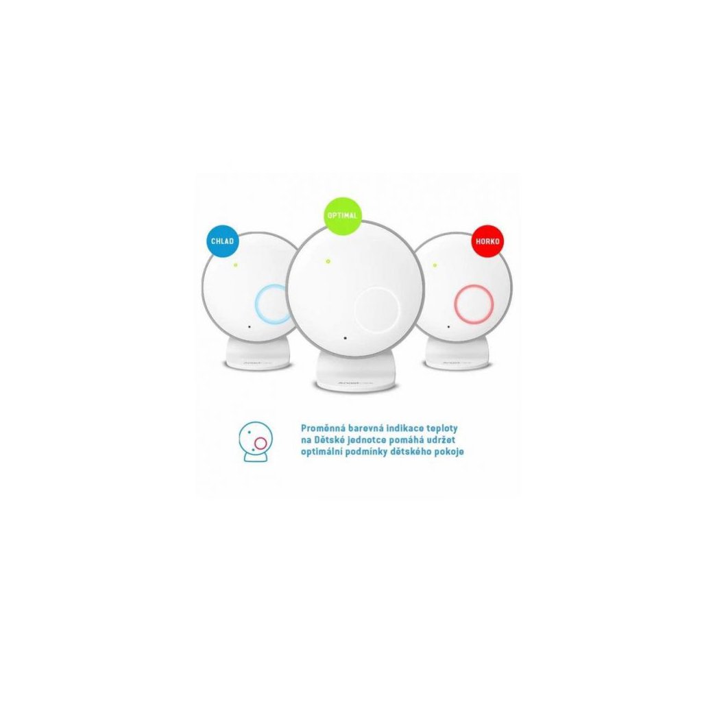Monitor má vstavaný teplomer, ktorý meria aktuálnu teplotu v miestnosti, kde je dieťa. Farebný indikátor na Detskej jednotke vás upozorní, či je teplota v izbe príliš vysoká, nízka, alebo sú tam nastavené ideálne podmienky pre dieťa.