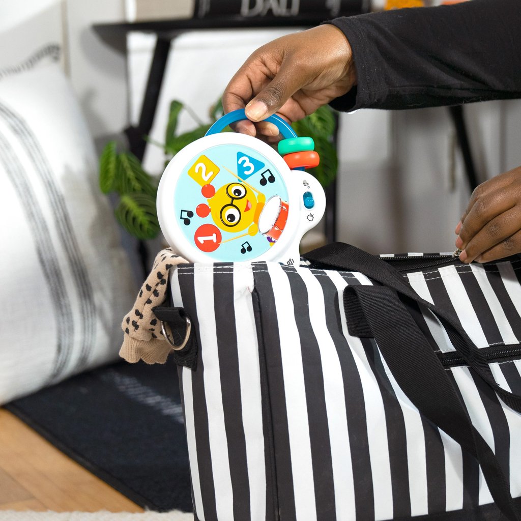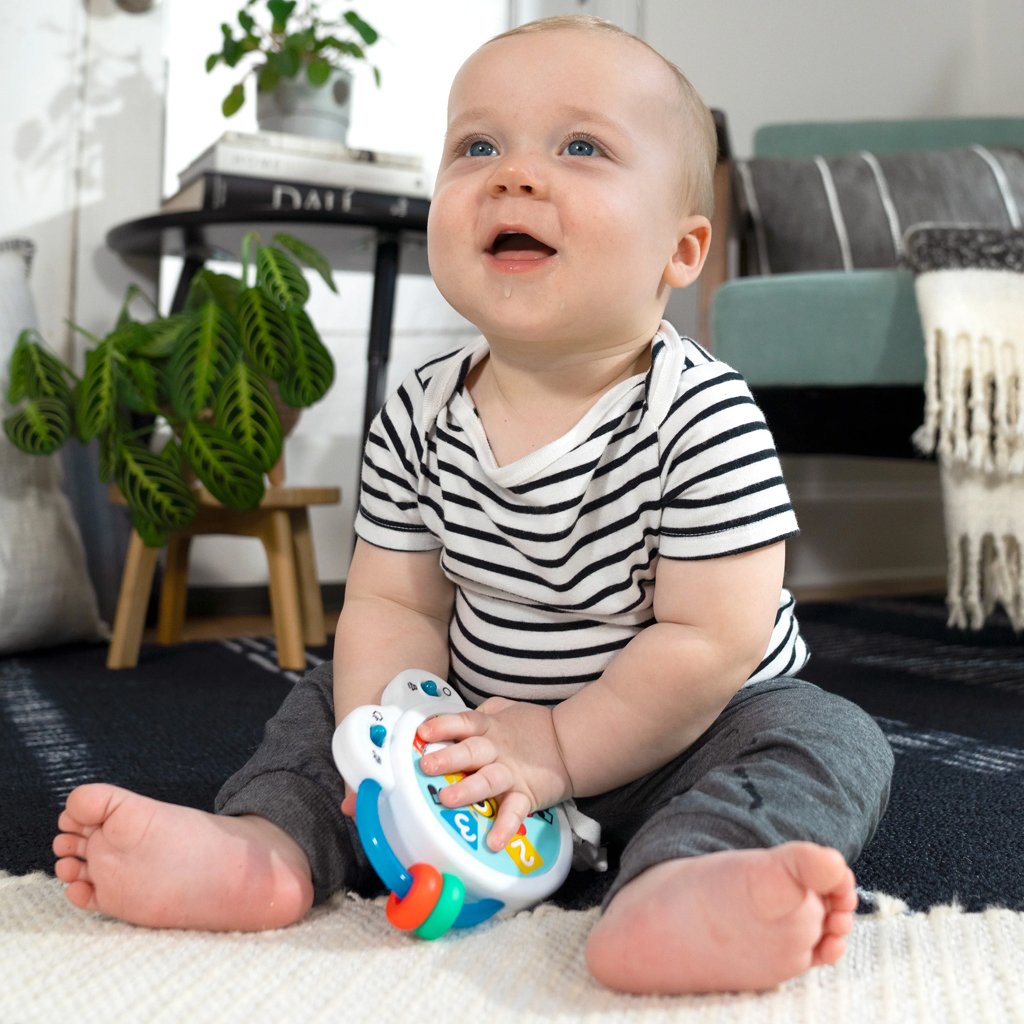 Pomôžte bábätku objavovať hudbu s hudobnou hračkou – bubnom Tiny Tempo. Tento ľahký a prenosný bubon obsahuje 21 reálnych zvukov nástrojov, 6 klasických melódií a dvojitý prstenec s korálkami, ktorý podporuje hudobné objavovanie, učenie sa princípu príčina–následok a rozvoj jemnej motoriky. Vďaka dvom herným režimom môže bábätko v režime Drum Play vytvárať jedinečné rytmy jednoduchým ťuknutím, alebo si v režime Melody zahrať spolu so 6 klasickými skladbami. Každé ťuknutie podporuje učenie príčina–následok. Hračka s korálkami pomáha rozvíjať obratnosť a jemnú motoriku. Farebné nálepky zoznamujú s farbami, číslami a tvarmi a obľúbený hudobný kamarát Cal the Caterpillar z kníh a videí Baby Einstein povzbudzuje bábätko pri hudobnom objavovaní. Bubon je ideálny na hudbu na cestách – je malý, ľahký, ľahko sa drží aj trasie a podporuje hudobné zapojenie v kočíku, na cestách aj pri hre doma. Vyžaduje 2 AA batérie. Čistí sa jednoducho utretím.