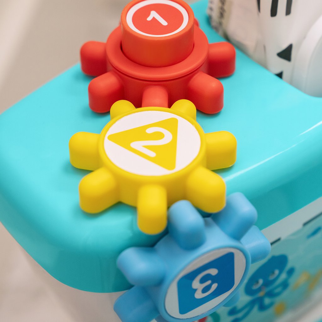 - Tlačidlo splachovania s farebnými točiacimi sa ozubenými kolieskami, ktoré vydávajú zvuky splachovania a hravú hudbu; Každým stlačením sa dieťa učí príčine a následku a buduje jemnú motoriku.