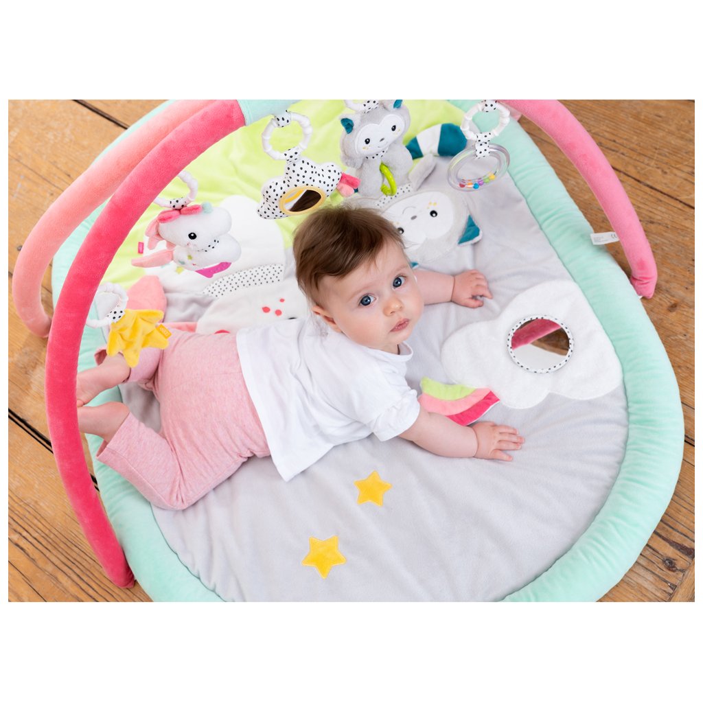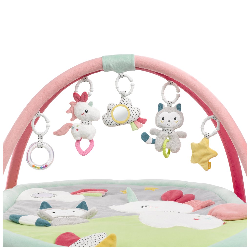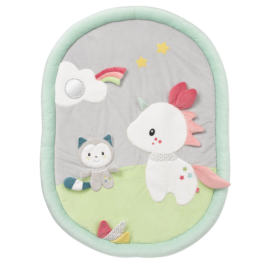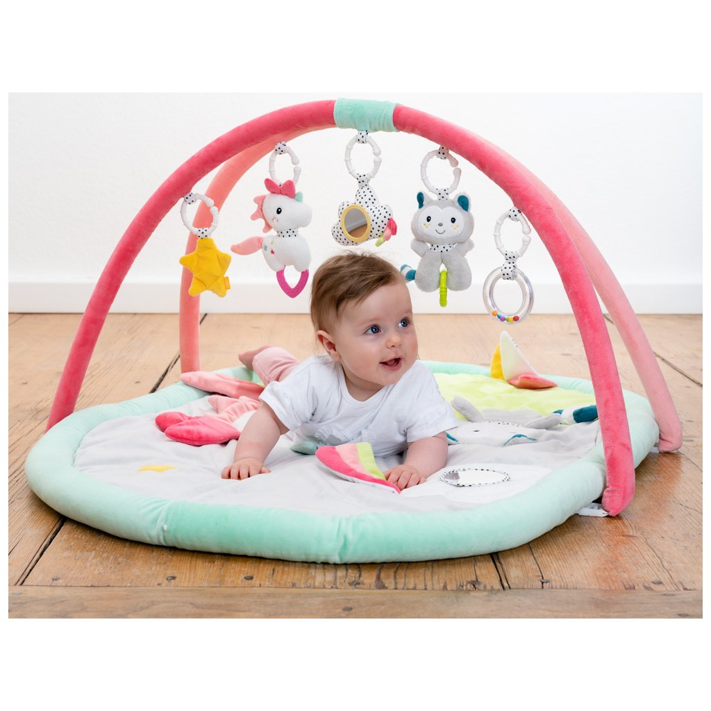 Mäkká prešívaná deka Aiko & Yuki pozýva dieťa k dotyku, maznaniu a hraniu na ležiacej ploche s rozmanitými materiálovými štruktúrami a povrchy. Trojrozmerné postavičky visiace na hracom oblúku napomáhajú cielenému uchopeniu a koordinácii ruka-oko. Dieťa tu zaujme pískací jednorožec a v ňom skrytý škrečok, hrkajúca mačka, hrkálkový mrak a šuštiaca hviezda. Veselé zvieratká tak podporujú zábavu pri hraní, zvyšujú pozornosť dieťaťa a cibrí jeho zmysly i motoriku.
