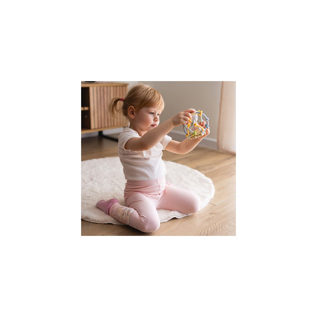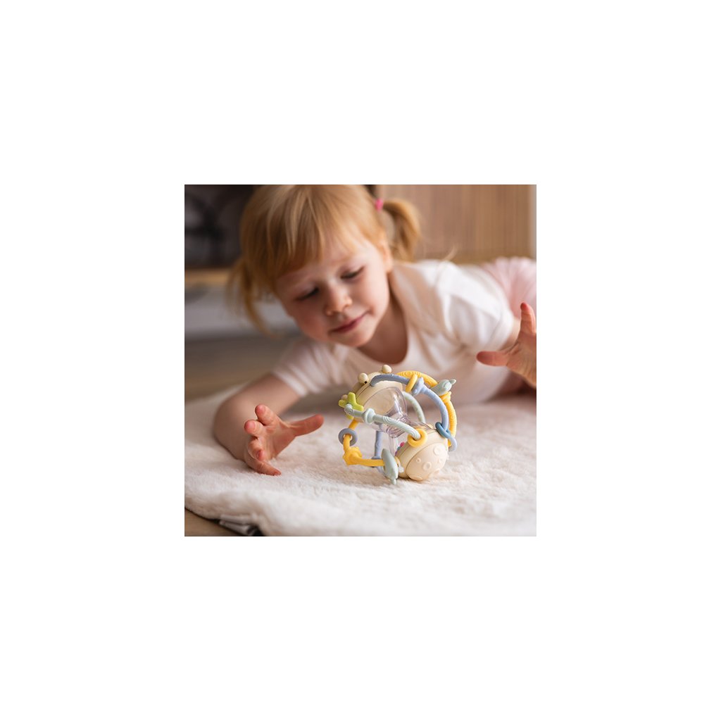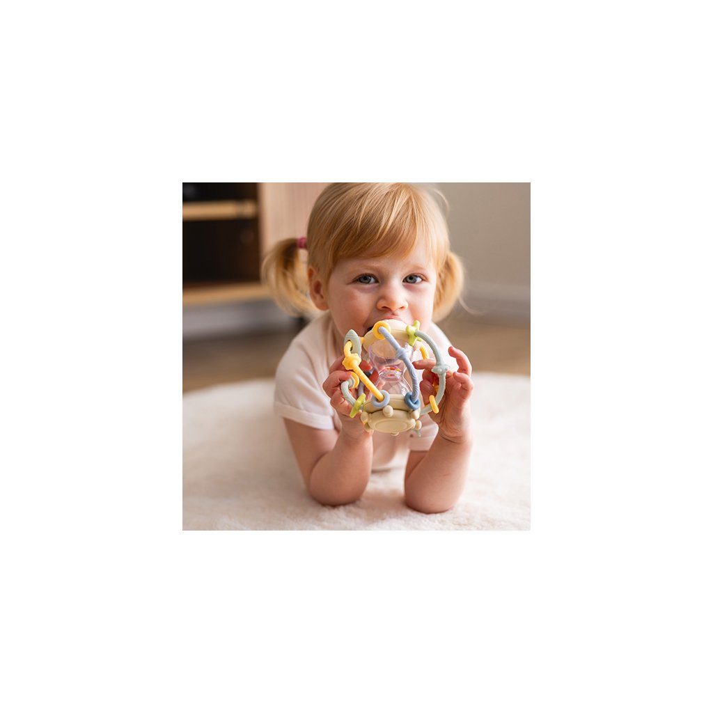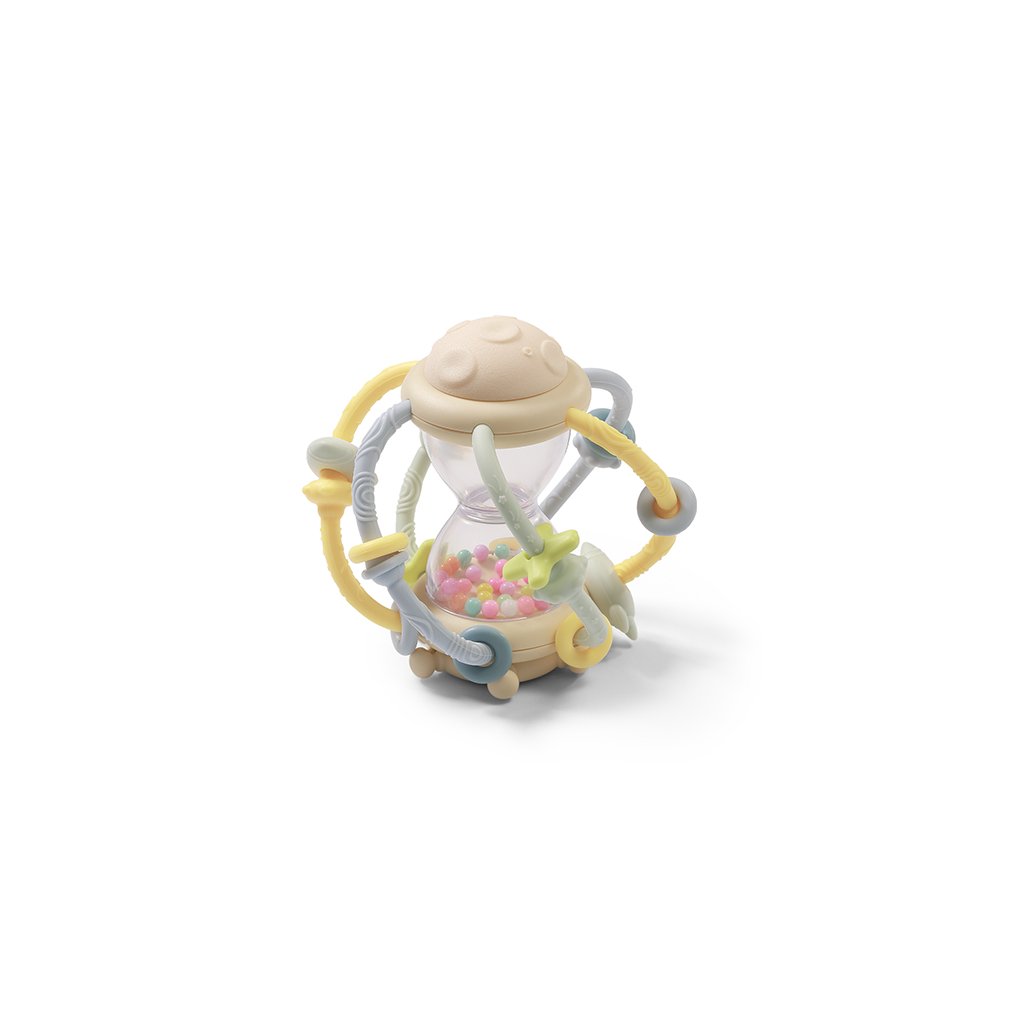 Senzorická hračka v tvare presýpacích hodín – hryzačka a hrkálka v jednom. Táto junikátna hračka spája mäkkú hryzačku a stimulačnú hrkálku. Bola navrhnutá s ohľadom na zvedavosť bábätiek – perfektne padne do malých rúk a ponúka mnoho možností na objavovanie. Farebná hryzačka s jemnými výstupkami upokojuje ďasná počas prerezávania zúbkov, zatiaľ čo priesvitné presýpacie hodiny s farebnými guľôčkami jemne hrkajú a priťahujú pozornosť. Vaše dieťa môže posúvať pohyblivé prvky po silikónových oblúkoch, sledovať guľôčky v presýpacích hodinách či otáčať kolieskom na spodku hračky, ktoré vydáva príjemný zvuk. Hračku je z netoxického silikónu a plastu PP, takže je bezpečná na hru už od prvých mesiacov života.