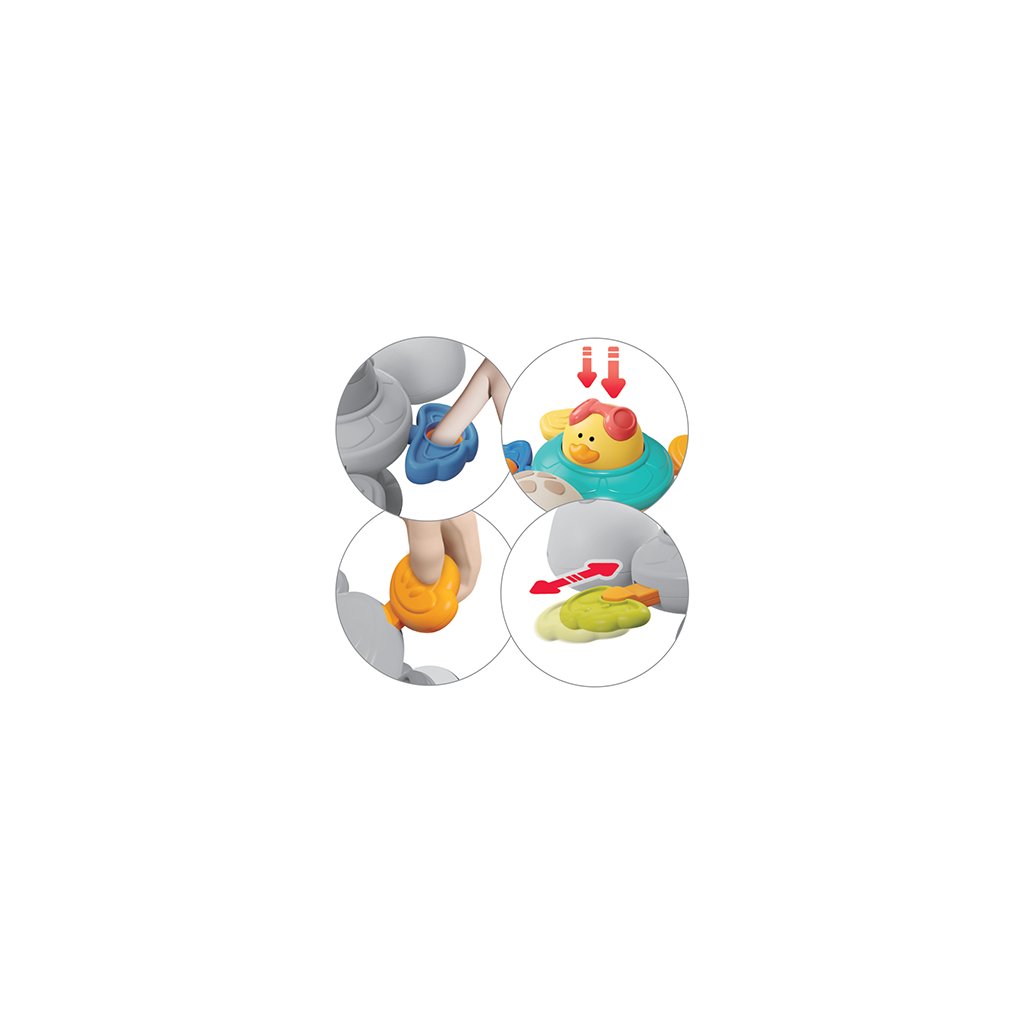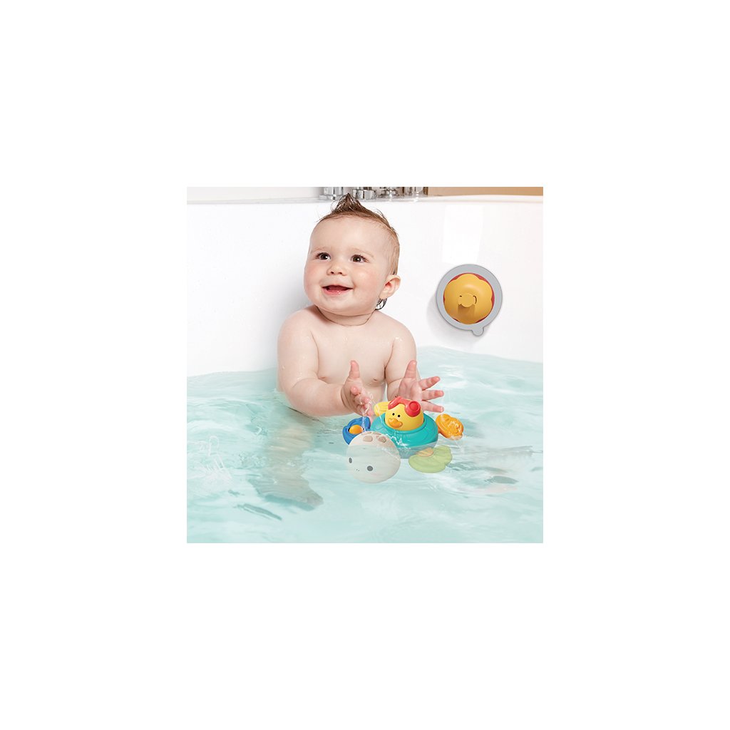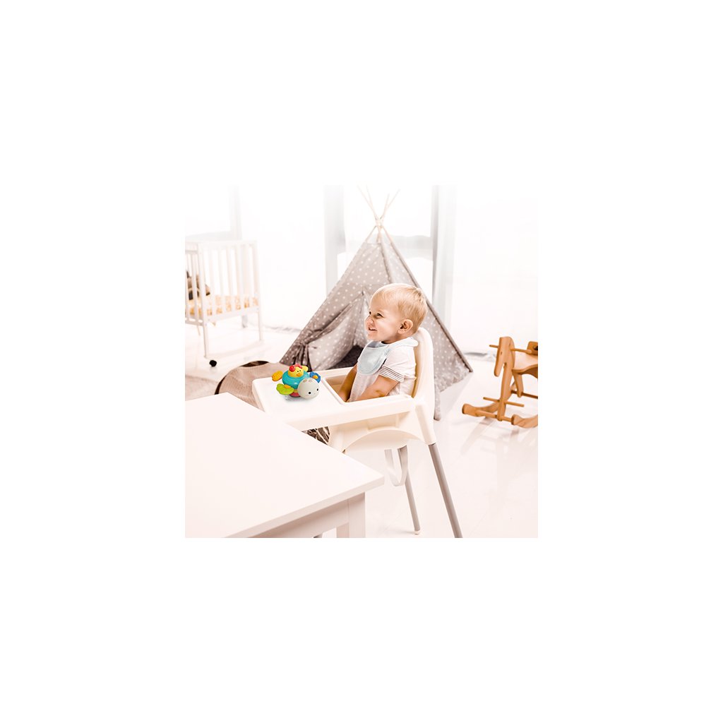 - Korytnačka sa skladá z rôznych prvkov ako otáčajúce sa telo, interaktívne tlačidlo, hrkálka a hryzačka. Farebné a pohyblivé časti rozvíjajú zmysly dieťaťa a podnecujú kreativitu pri objavovaní.