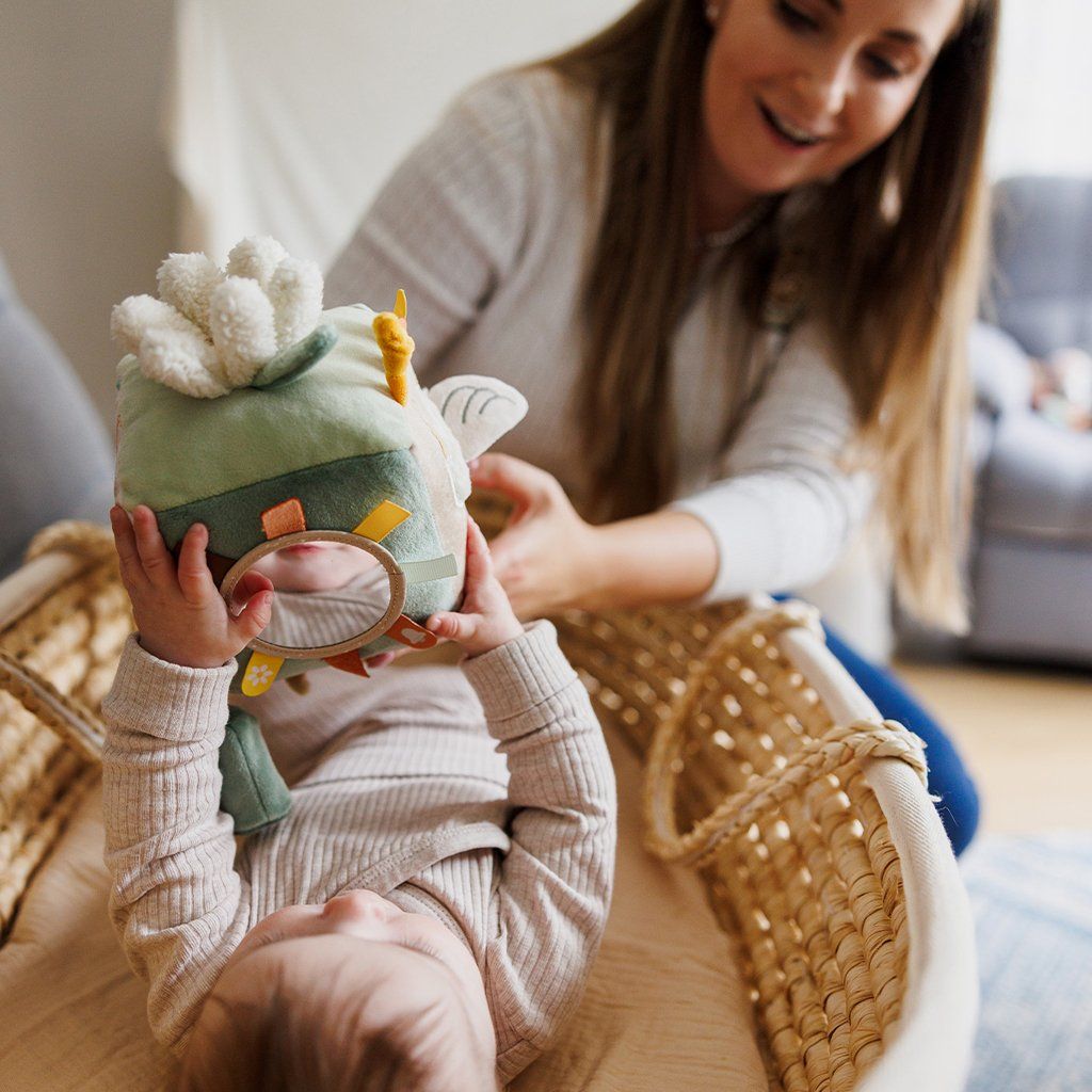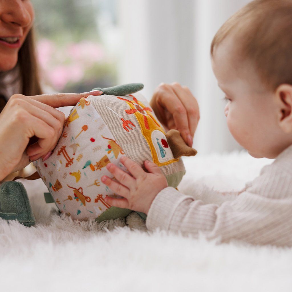 Mäkký materiál a rozmanitosť textúr stimulujú hmat, zatiaľ čo rozmanitosť farieb a tvarov púta ich zrak. Šuštiaci zvuk a jemná hrkálka rozvíjajú sluch, zrkadlo obohacuje hru a farebné stužky a uzly povzbudzujú k uchopeniu.