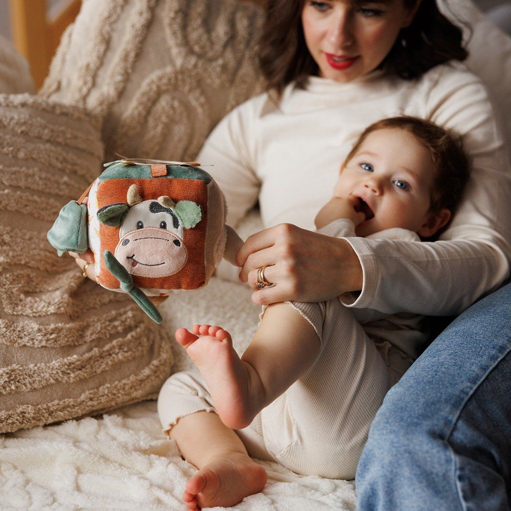 Kocka Cow Bingo plná prekvapení je senzorická hračka pre bábätká, ktorá rozvíja ich zmysly a podporuje osvojovanie nových zručností. Zaveste ju na postieľku, kočík alebo autosedačku – vždy blízko vášho dieťaťa.