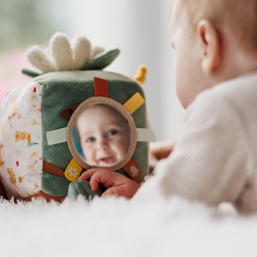 - Zrkadlo: Zrkadlo na tejto detskej hernej kocke ukazuje svet z druhej strany. Vaše dieťa bude reagovať zvedavosťou na svoj odraz a rozvíjať kognitívne zručnosti. Hra je ešte fascinujúce!