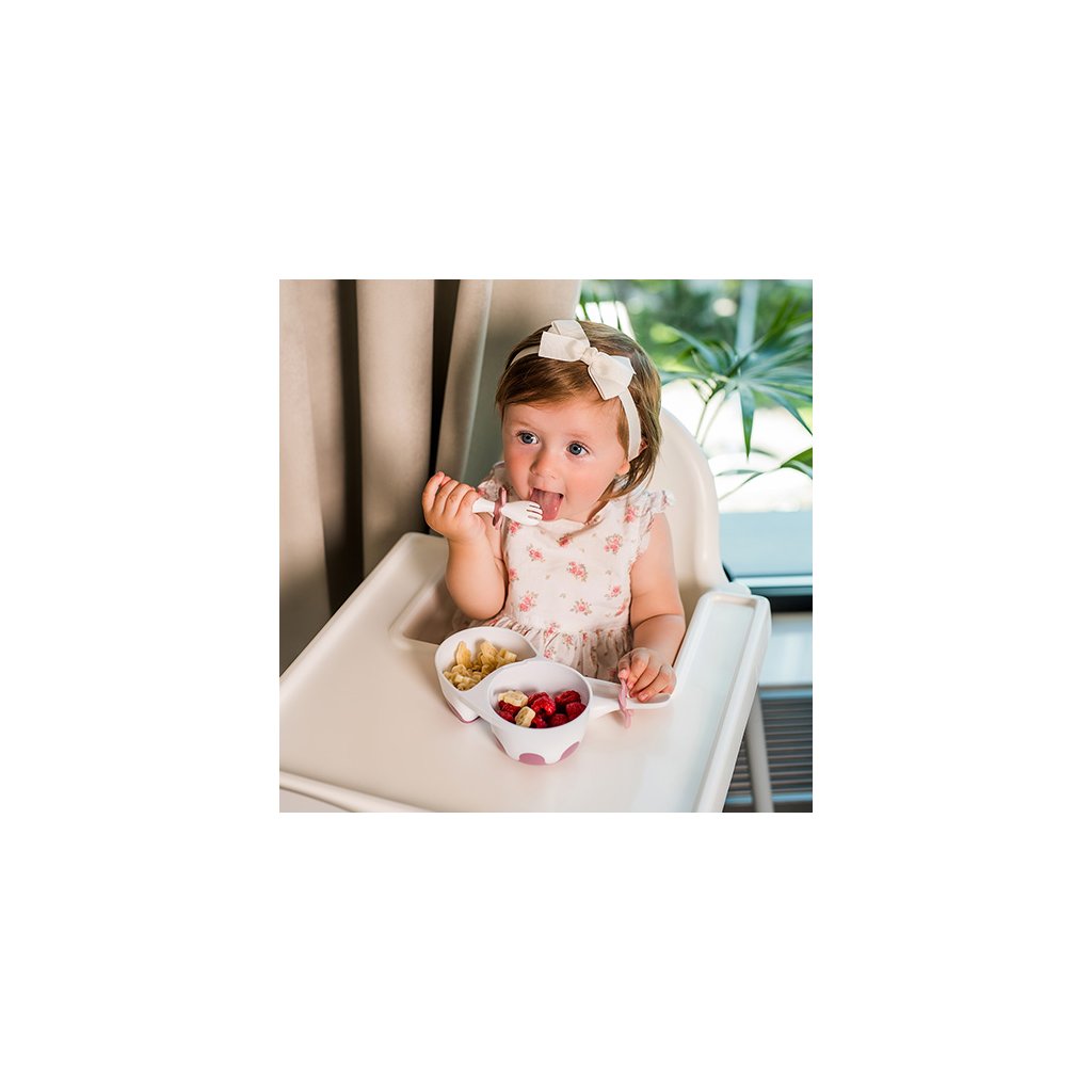 Dokonalá súprava na prvé samostatné jedenie pre Vašu princezničku, s ktorou sa naučí jesť bez vašej pomoci. Príbor má ergonomický tvar a širokú zaoblenú rukoväť, ktorá dokonale padne do rúk Vášho dieťatka. Špeciálna bezpečnostná časť v tvare kvetinky zabráni, aby sa príbor dostal príliš hlboko do úst a krku, čím chráni vaše dieťa pred náhodným udusením. Vďaka nej tiež môžete príbor položiť na stôl, bez toho, aby sa hroty riadu nedotýkali povrchu stola, čím sa zachová vyššia hygiena a čistota.