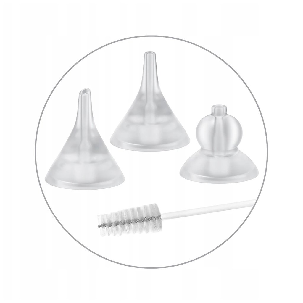 3 Mäkké silikónové nadstavce Ultra mäkké 3 silikónové nadstavce, ktoré možno prispôsobiť typu sekrétov a veku dieťatka. Obsahuje aj prídavnú čistiacu kefku. Zaručene hygienické a prispôsobené potrebám tých najmenších.