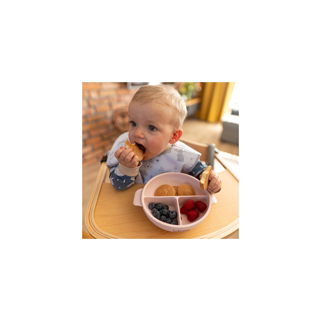 Zavádzate do jedálnička svojho bábätka tuhé jedlo alebo skúšate metódu BLW? Tento silikónový tanierik s tromi priehradkami vám to výrazne uľahčí. Umožní dieťaťu ochutnávať nové chute, podporuje samostatné kŕmenie a vďaka prísavke udrží tanier pevne na mieste – bez rizika prevrátenia. Viečko udrží jedlo teplé a čerstvé, takže môžete pripraviť jedlo vopred alebo uschovať zvyšky na neskôr. Tri samostatné priehradky umožňujú servírovať rôzne druhy jedál bez miešania chutí. Zaoblené okraje a vyššie steny uľahčujú naberanie jedla, či už rukou alebo príborom. Tanier aj viečko sú vyrobené z odolného, netoxického silikónu bez BPA, ktorý môžete používať v mikrovlnnej rúre aj umývačke riadu.