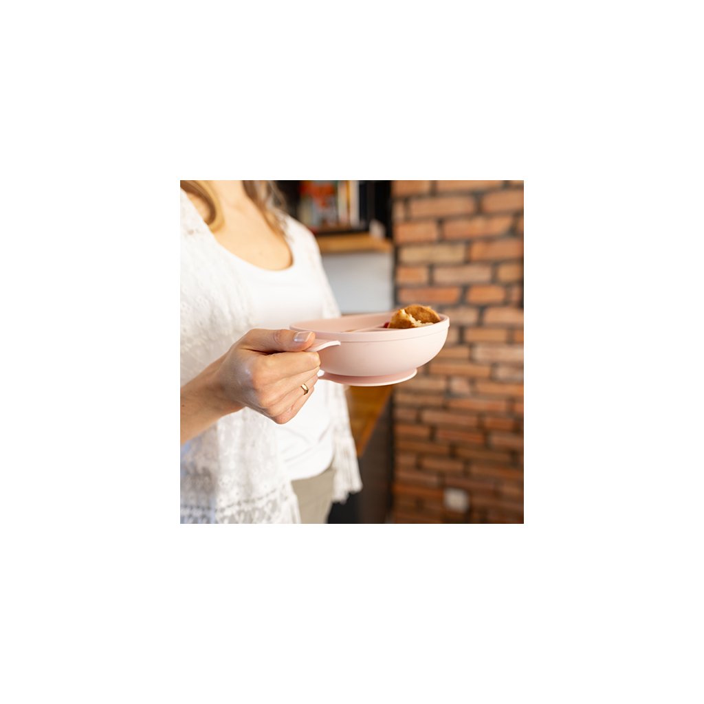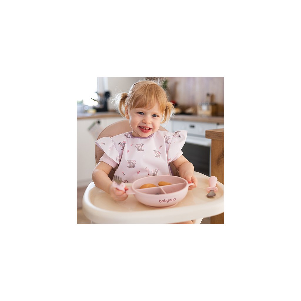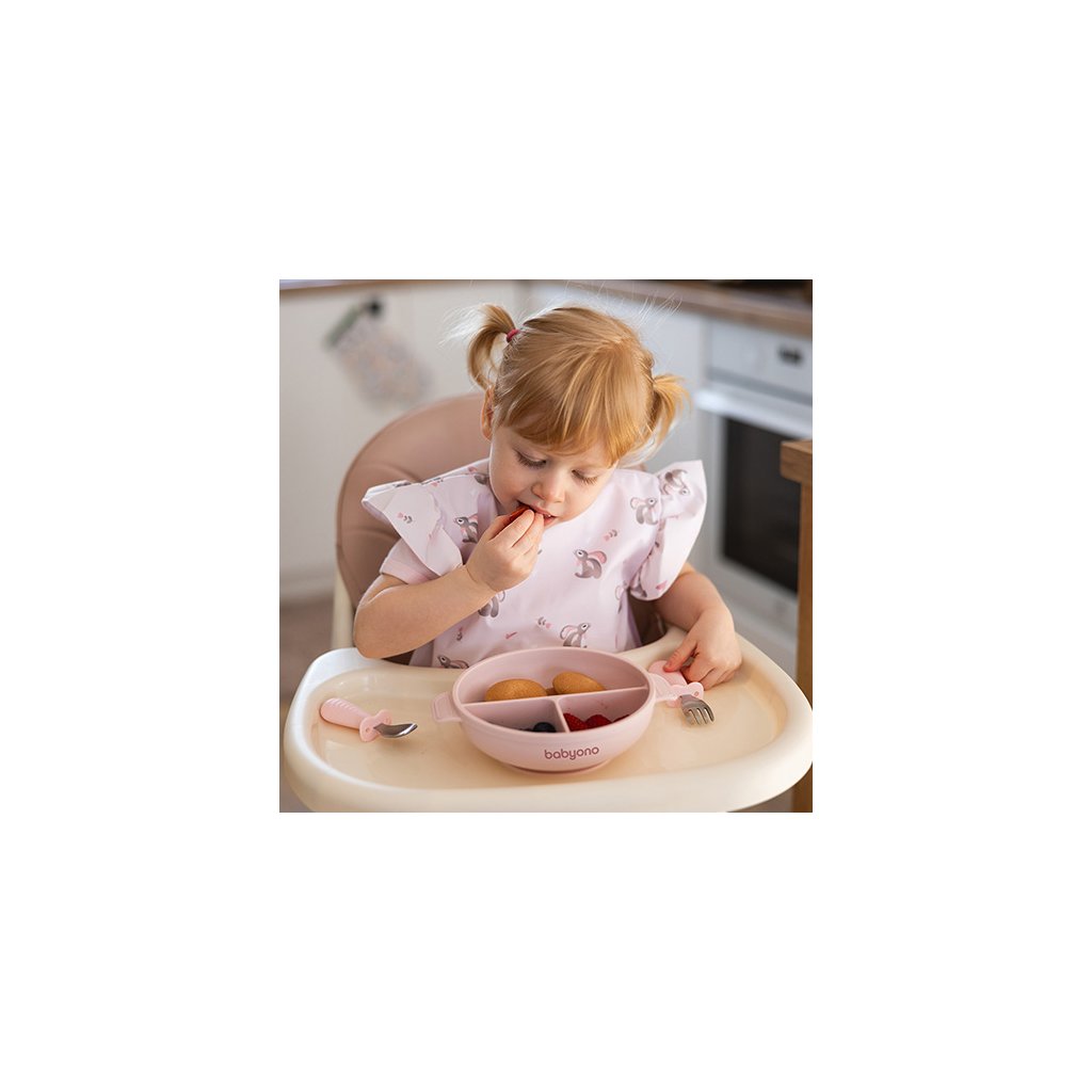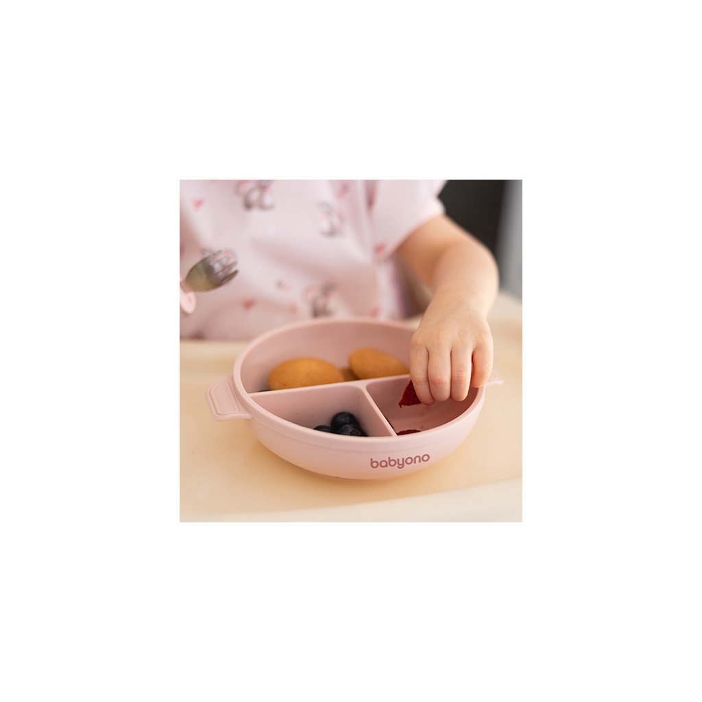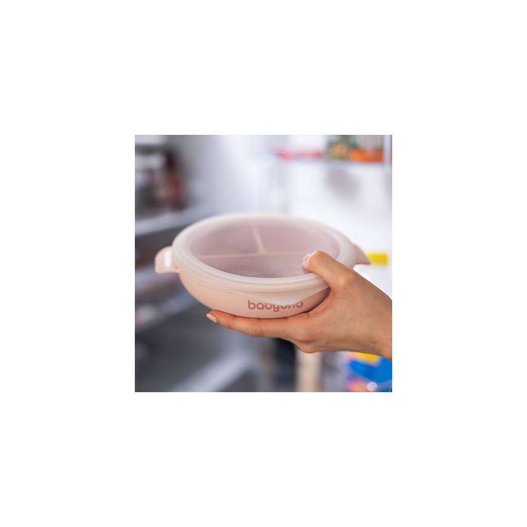 BABYONO Tanier silikónový s prísavkou a viečkom ružový 6m+