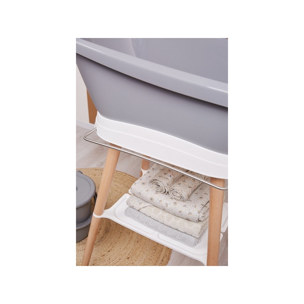 Veľmi stabilný vaňový stojan Sense má nohy vyrobené z lakovaného bukového dreva s certifikáciou FSC. To dodáva stojanu teplý moderný vzhľad. Je vybavený praktickými pomôckami; vpredu je pripevnený držiak na uteráky. Priestranná plastová polička poskytuje dostatok miesta napríklad na šampón, žinku, vodné hračky alebo šampón. To znamená, že máte po ruke všetky potrebné veci, aby ste si s dieťaťom mohli kúpanie užiť. Inovatívny systém upevnenia zaisťuje, že vaňu možno ľahko pripevniť k stojanu a rovnako ľahko sňať. Po kliknutí môžete svoje bábätko nerušene a bezpečne kúpať.