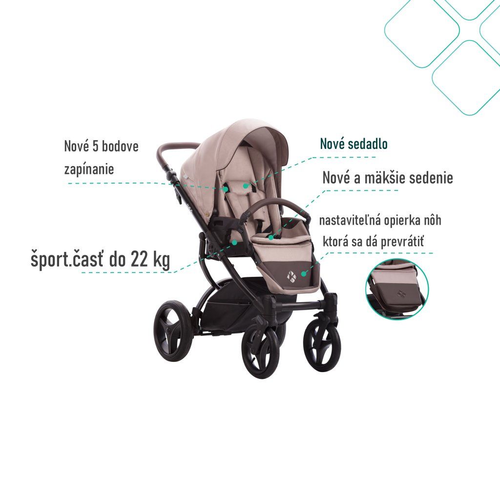- Hlboká vanička s novým vzhľadom a novými funkciami : Aktivne skladanie a polohovanie striešky na vaničke , odľahčena ultraľahká vanička