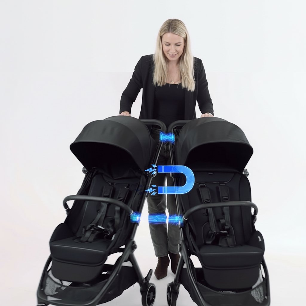 Connect Mini je jediný kočík svojho druhu s magnetickým prepojovaním, ktoré počas 1 sekundy spojí kompatibilné doplnky – a v prípade potreby aj dva kočíky dokopy a vytvorí tak praktický systém pre dve deti.