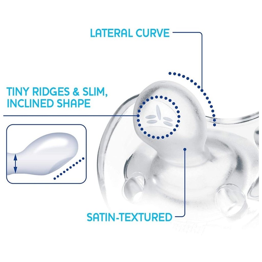- extrémne mäkká zúžená pätička cumlíka umožňuje dieťaťu zavrieť ústa a redukuje riziko nerovnomerných zubných oblúkov (je ortodonticky korektná)