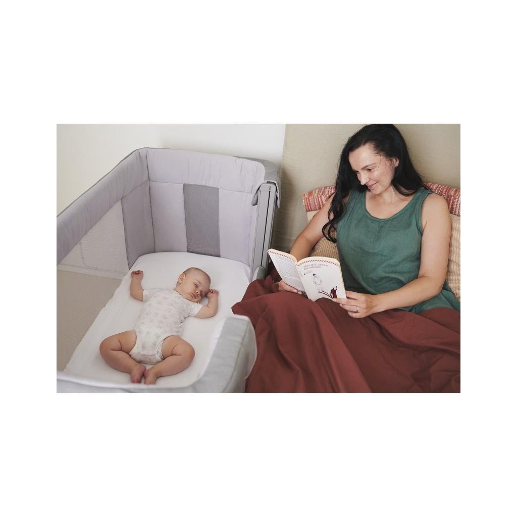 - patentovaný systém zabraňuje tomu, aby bočná strana zostala spustená, keď nie je detská postieľka úplne pripevnená k rodičovskej posteli