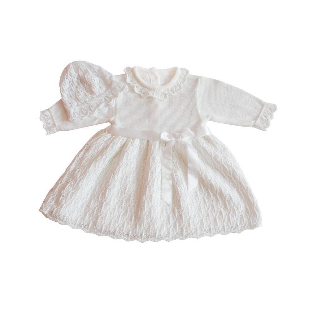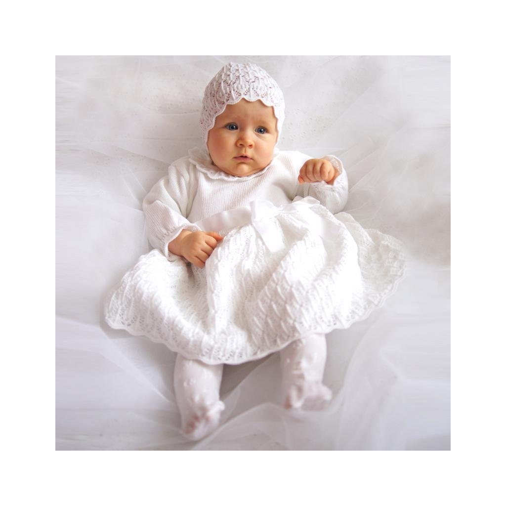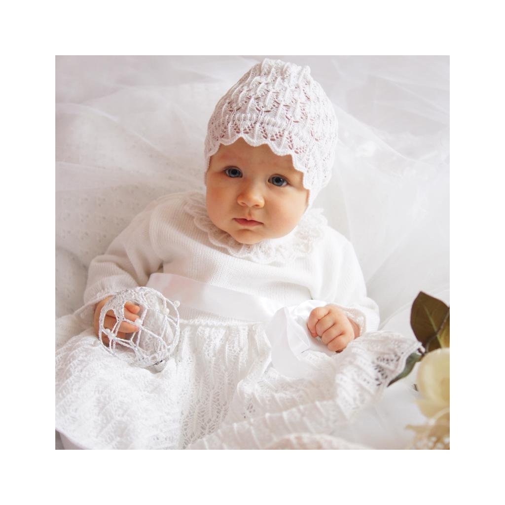 Súprava pozostávajúca zo šiat a čiapky je vyrobená z pleteniny s ozdobným ažurovým vzorom a ozdobnou stuhou.