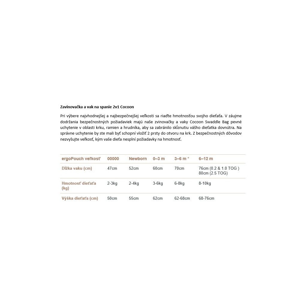 Vak Cocoon Swaddle je vyrobený a vyplnený organickou bavlnou s certifikátom GOTS, s elastanom vo vonkajšej tkanine a bambusom v podšívke. To znamená, že je dostatočne pevný, aby obmedzil úľakový reflex, a zároveň umožňuje rozťahovanie a pohyb pre zdravý rast. Roztiahnutosť umožňuje väčšie pohodlie a dieťatku umožňuje pohybovať rukami do polohy, v ktorej sa samo usadí vo vnútri zavinovačky. Mäkká, priedušná organická bavlna a bambus sú certifikované ako netoxické, farbené farbivami na báze vody a šetrné k pokožke novorodencov a pokožke so sklonom k výskytu ekzémov. Zips chráni aj jemnú pokožku vášho dieťaťa a praktické cvočky na ramená umožňujú premeniť Cocoon zo zavinovačky s rukami na spací vak s rukami, keď dieťa vykazuje známky prevracania. Zvonovitý tvar je schválený Medzinárodným inštitútom pre dyspláziu bedrového kĺbu ako zdravý pre bedrá a podporuje správny vývoj bedrových a ramenných kĺbov. Obojsmerný zips umožňuje rýchlu a jednoduchú výmenu plienky počas spánku s minimálnym narušením.