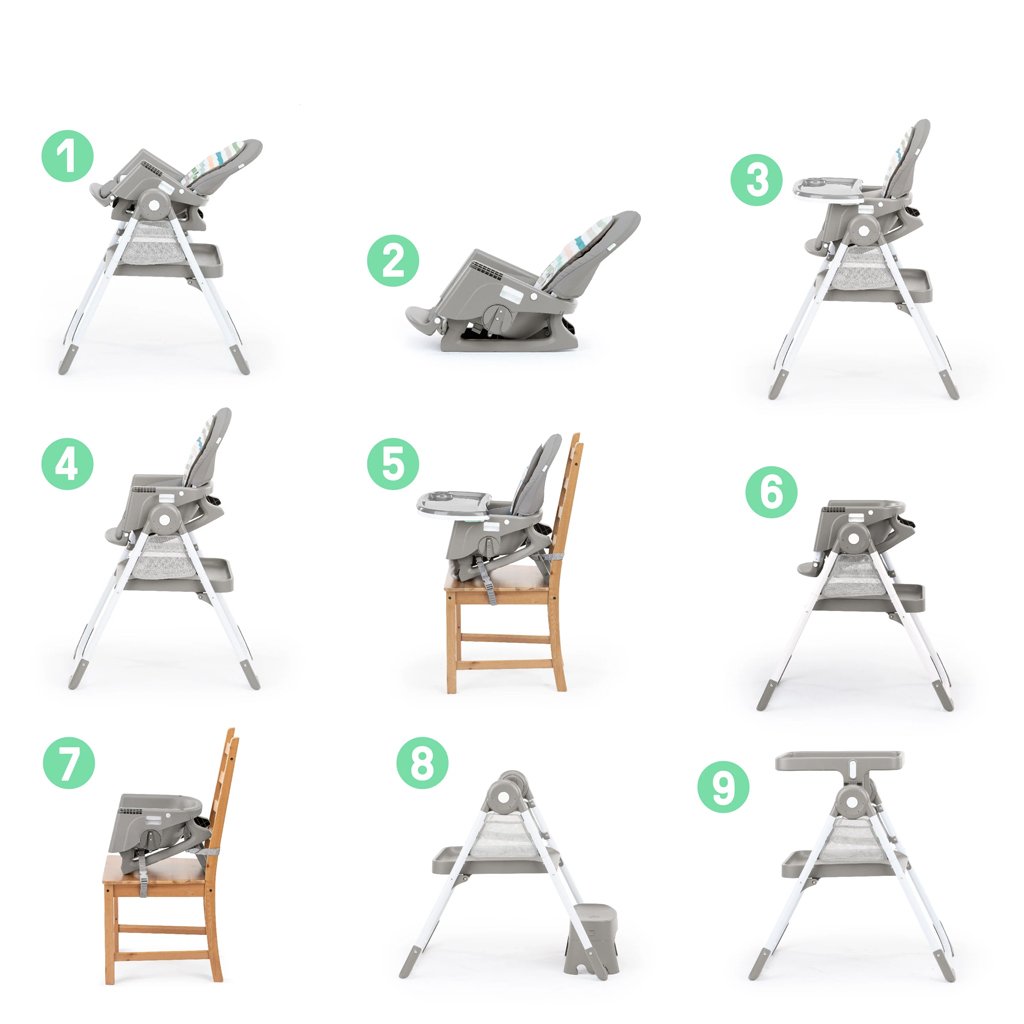 - 9 režimov pre jedno dieťa: plne sklopné kresielko, odnímateľné hojdacie kreslo, vysoká stolička, stolička k stolu, prenosná stolička na bežnú stoličku, stolička pre batoľa, podsedák, učiaca/kuchynská veža, kreatívny stolík so stoličkou