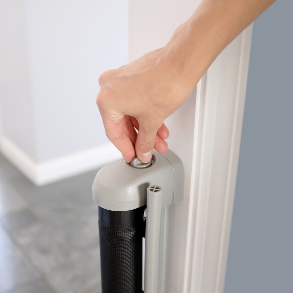 - Rolovací dizajn šetrí priestor – zábrana sa po zložení schová do elegantného držiaka
