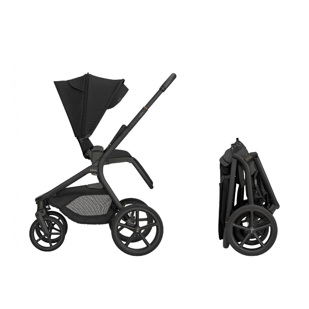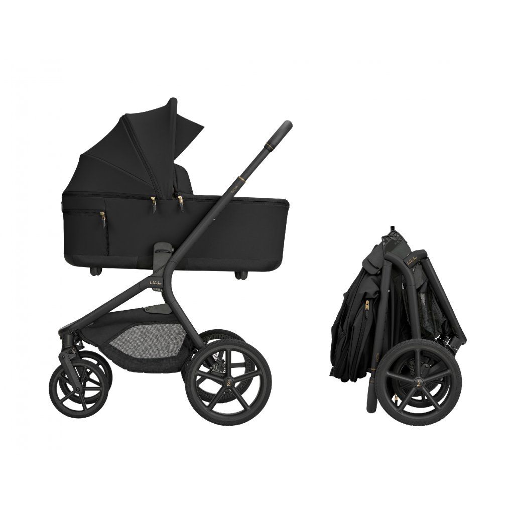 Po zložení kočík samostatne stojí. Pre ľahké prenášanie je pripravený popruh cez rameno a madlo.