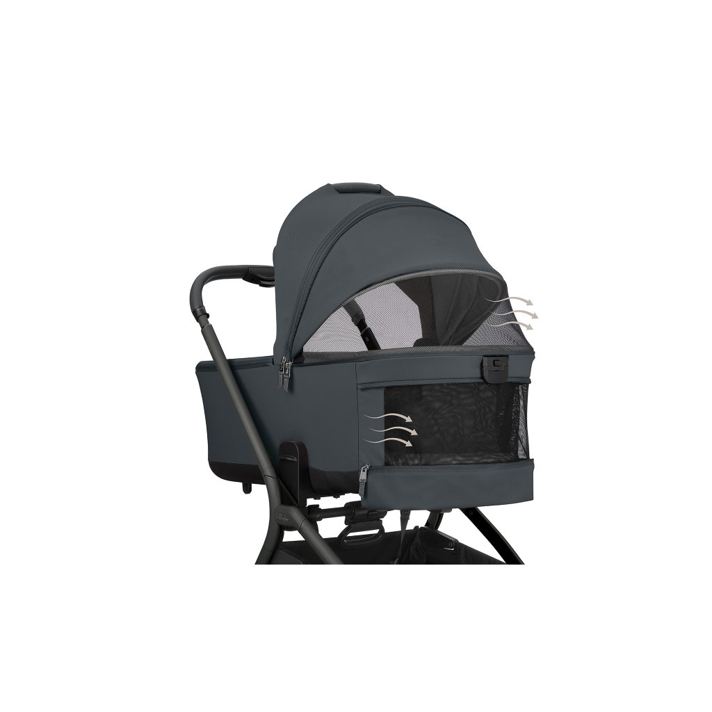 Pre pohodlie dieťaťa je súčasťou obojstranný mäkký matrac so zimnou stranou z kvalitného zamatového materiálu a letnou stranou z priedušnej sieťoviny pre lepšiu ventiláciu. Strieška má zipsové predĺženie, slnečnú clonu a dopĺňa ju extra slnečná clona pre maximálny tieň. Ventiláciu zaisťujú sieťované vetracie otvory na strieške aj v oblasti hlavy. Praktická je aj vrecko na telefón na zips.Vodeodolný textilný materiál s UPF 50+ chráni dieťa pred poveternostnými vplyvmi a slnečným žiarením.