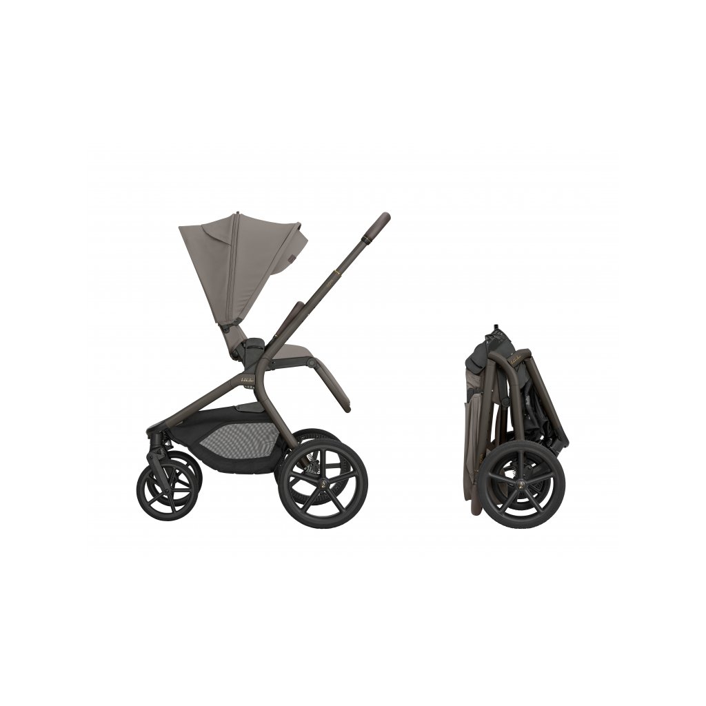Po zložení kočík samostatne stojí. Pre ľahké prenášanie je pripravený popruh cez rameno a madlo.