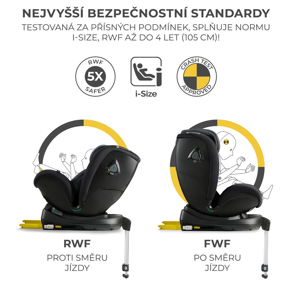 Bezpečnosť detí je pre nás na prvom mieste. Preto sme vyvinuli detskú autosedačku XRIDER i-Size, otočnú autosedačku, ktorá spĺňa normu R129 i-Size a pozitívne prešla prísnymi crash testami. Autosedačka XRIDER i-Size je vhodná pre deti s výškou od 40-125 cm (do 7 rokov alebo 25 kg) a umožňuje ich prepravu smerom dozadu proti smeru jazdy približne do 4 rokov (RWF do 105 cm). RWF je najbezpečnejšia poloha pre malé deti, 5-krát bezpečnejšia ako FWF pri čelných nárazoch. Na posilnenie bezpečnosti má autosedačka okrem systému ISOFIX aj tretí oporný bod: stabilizačnú nohu.
