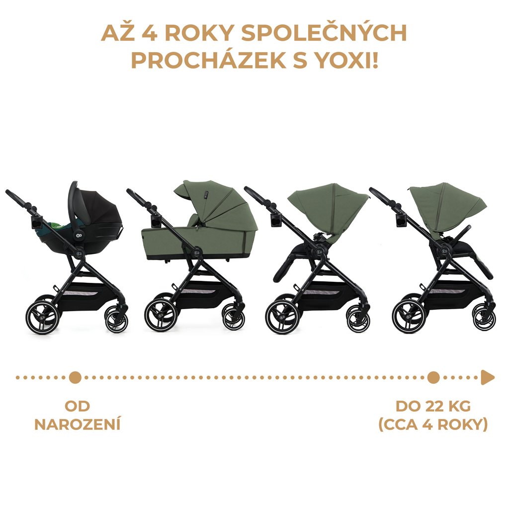 Stačí jediný pohľad, aby ste si YOXI zamilovali. Je to multifunkčný detský kočík 2 v 1, ktorý vás bude sprevádzať na prechádzkach od narodenia vášho dieťaťa až do 4 rokov (22 kg). Je mimoriadne obratný a veľmi ľahko sa s ním manévruje. Na samom začiatku budete svoje dieťa voziť v pohodlnej hlbokej vaničke s mäkkým matracom a veľkou nepremokavou strieškou s filtrom UPF50+, ktorá umožňuje odkrytie látky, takže vaše dieťa má panoramatický výhľad, keď leží na bruchu. Keď vaše dieťatko vyrastie, prenosná vanička sa zloží na plocho a uloží sa do skrine - a namiesto nej vás privíta športové sedadlo, ktoré sa dá pripnúť smerom dopredu alebo dozadu voči smeru jazdy.