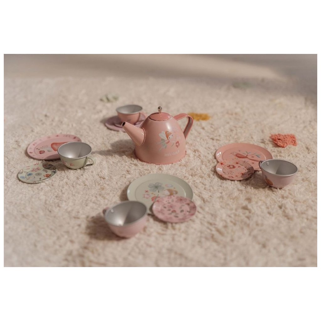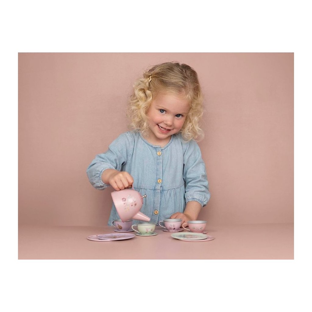 Neodolateľná sada čajovej kanvičky a štyroch hrnčekov s podšálkami v kvalitnom kovovom prevedení s krásnou potlačou motívov zo života na záhrade. Súprava poteší malú hostiteľku či hostiteľa pri organizovaní čajového večierka pre bábiky alebo pre kamarátov.