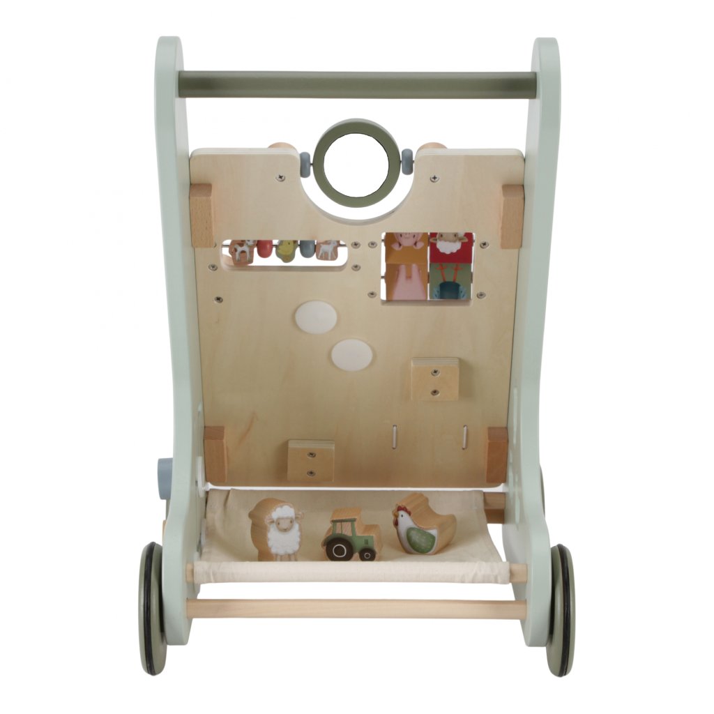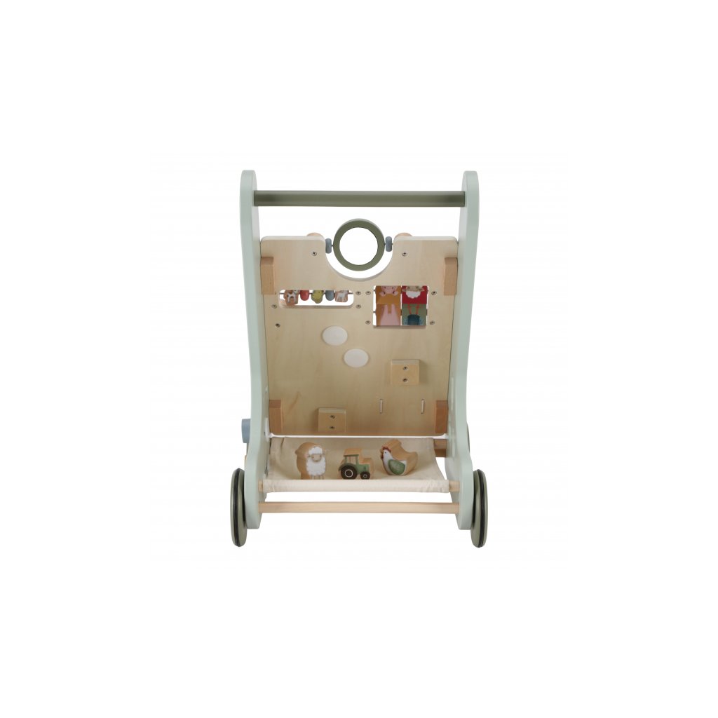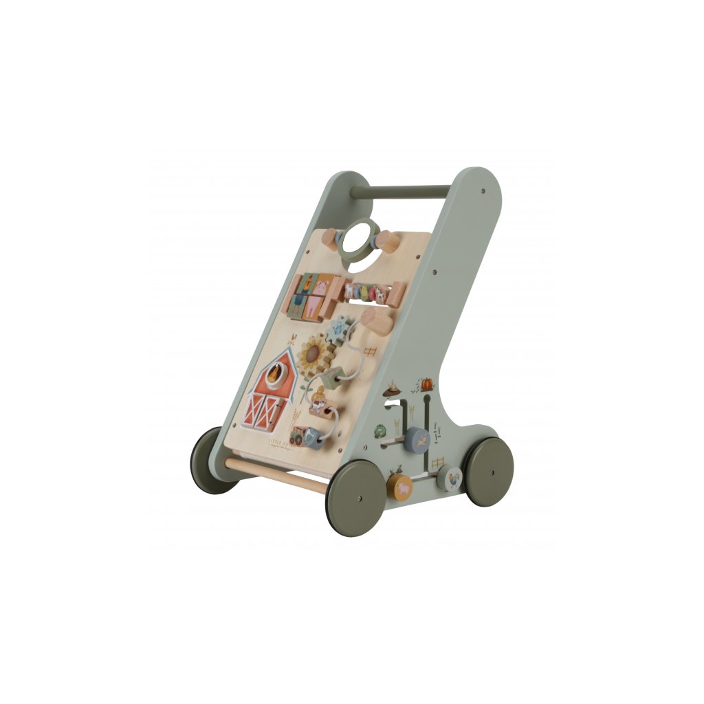 Drevené multifunkčné chodítko so stabilnou konštrukciou je ideálne na trénovanie chôdze detí od 12 mesiacov, ktoré sú takmer pripravené urobiť prvé kroky. Užite si spoločne radostné okamihy, keď vaše dieťa prvýkrát prejde celú miestnosť! Chodítko zároveň ponúka množstvo zaujímavých aktivít pre skúmanie a pozorovanie. Pohyblivé a otáčavé časti s krásnymi ilustráciami motívov zo života na farme dieťa zabavia a zároveň podporujú rozvoj jeho motorických zručností.