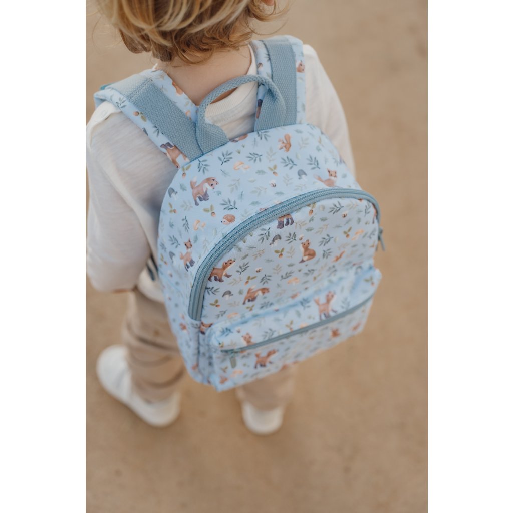 Rozkošný detský batoh potlačený obrázkami zvieratiek a motívmi zo života v lese je ideálnym doplnkom na výlety do prírody i prechádzky mestom. Batoh má nastaviteľné ramenné popruhy a hrudný pás na príjemné nosenie. Držadlo umožňuje prenášanie v ruke. Batoh je vybavený vonkajším vreckom na zips na uloženie drobností a vnútorný priestor s vreckom, elastickým držiakom na pitie a menovkou.