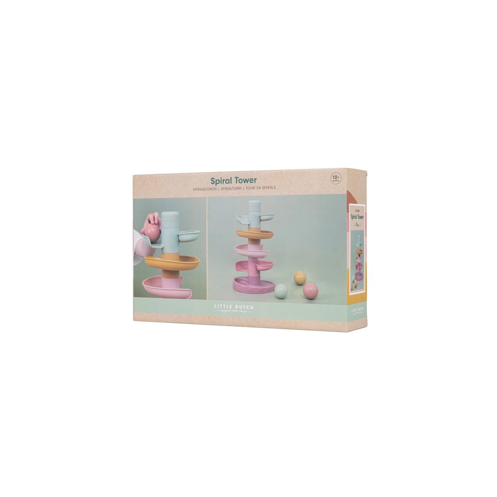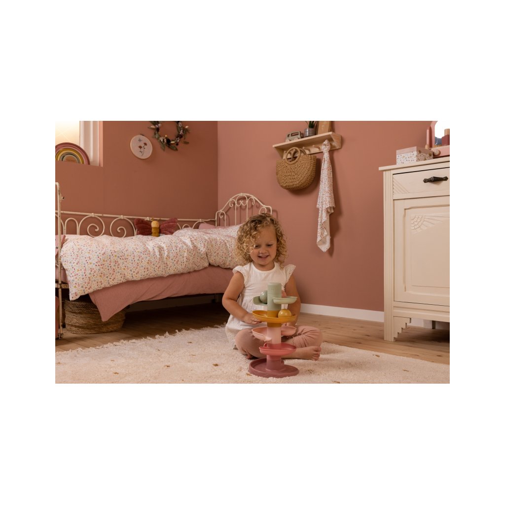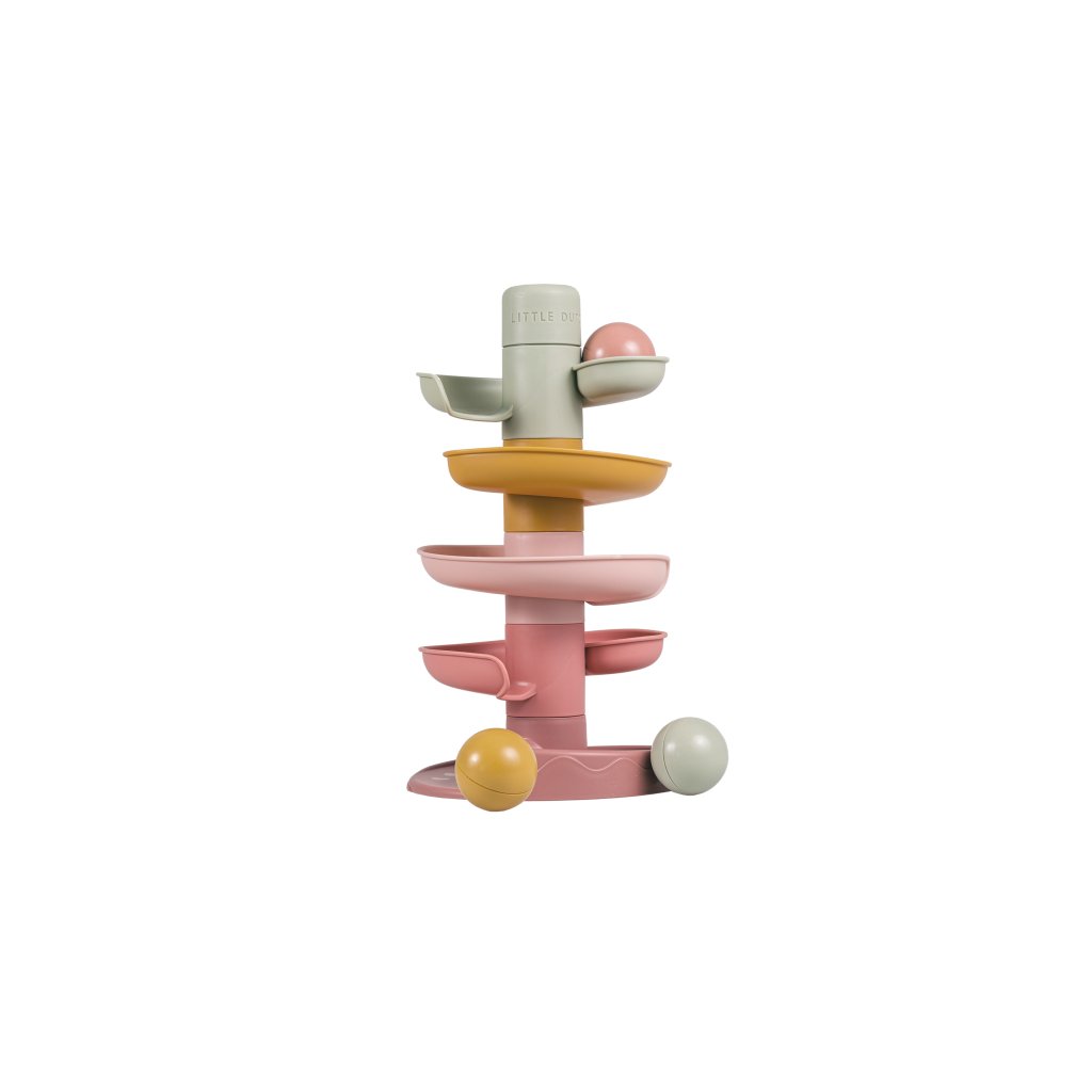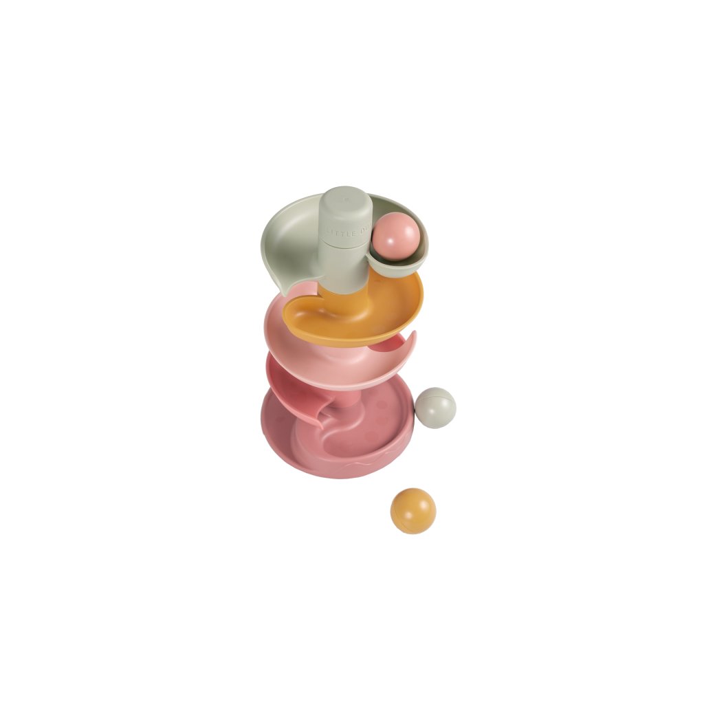 Sledujte s vašim dieťaťom, ako sa loptičky kotúľajú dookola jedna za druhou! Dráhu v jemných pastelových farbách ľahko zostavíte z piatich dielov a zábava môže začať.