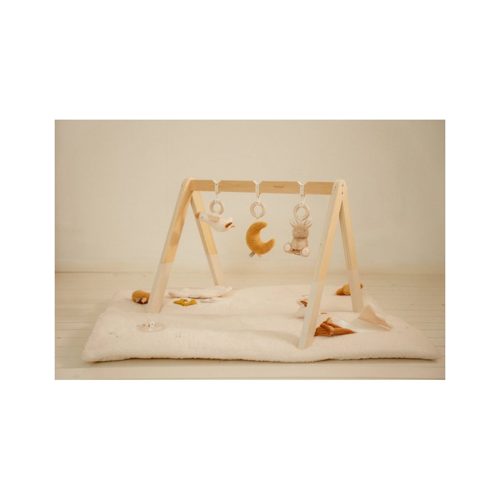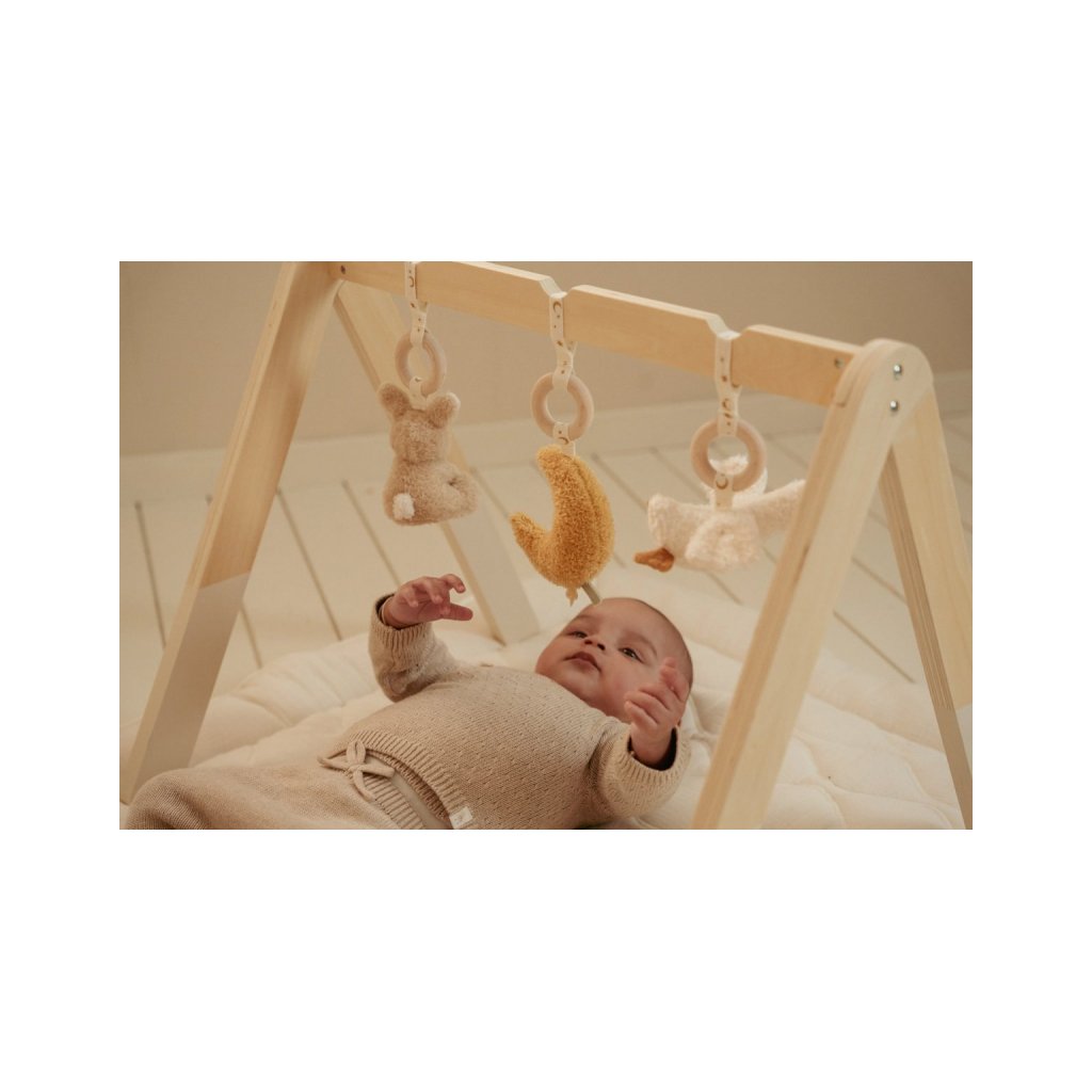 Štýlová drevená hrazdička s tromi zavesenými plyšovými hračkami v podobe králika, husi a mesiaca poskytne vášmu bábätku veľa zábavy pri hraní na deke. Jednotlivé hračky lákajú dieťa na skúmanie a dotýkanie, pri pohybe hrkajú a šuštia. Odnímateľné hračky je možné používať aj samostatne.
