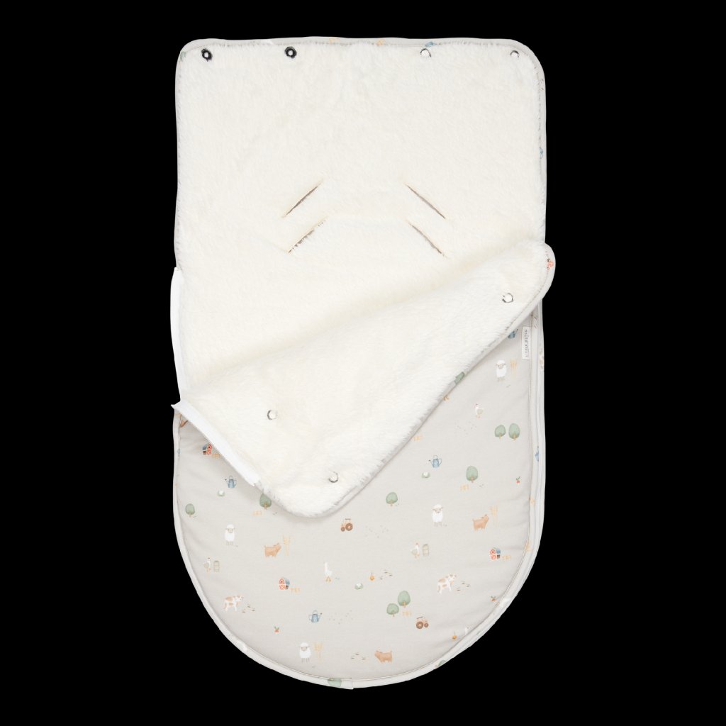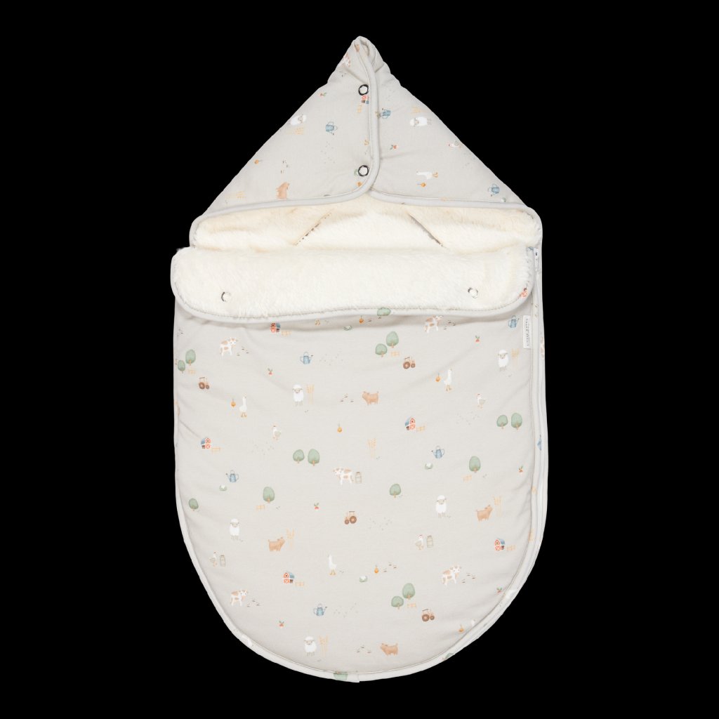 Teplý fusak do autosedačky aj do kočíka v krásnom dizajne kolekcie Little Dutch Farma je vyrobený z jemného džerseja s mäkkou plyšovou podšívkou pre udržanie vášho bábätka v teple. Vďaka cvokom môžete vytvarovať v hornej časti fusaku kapucňu pre väčšiu ochranu hlavičky dieťaťa.