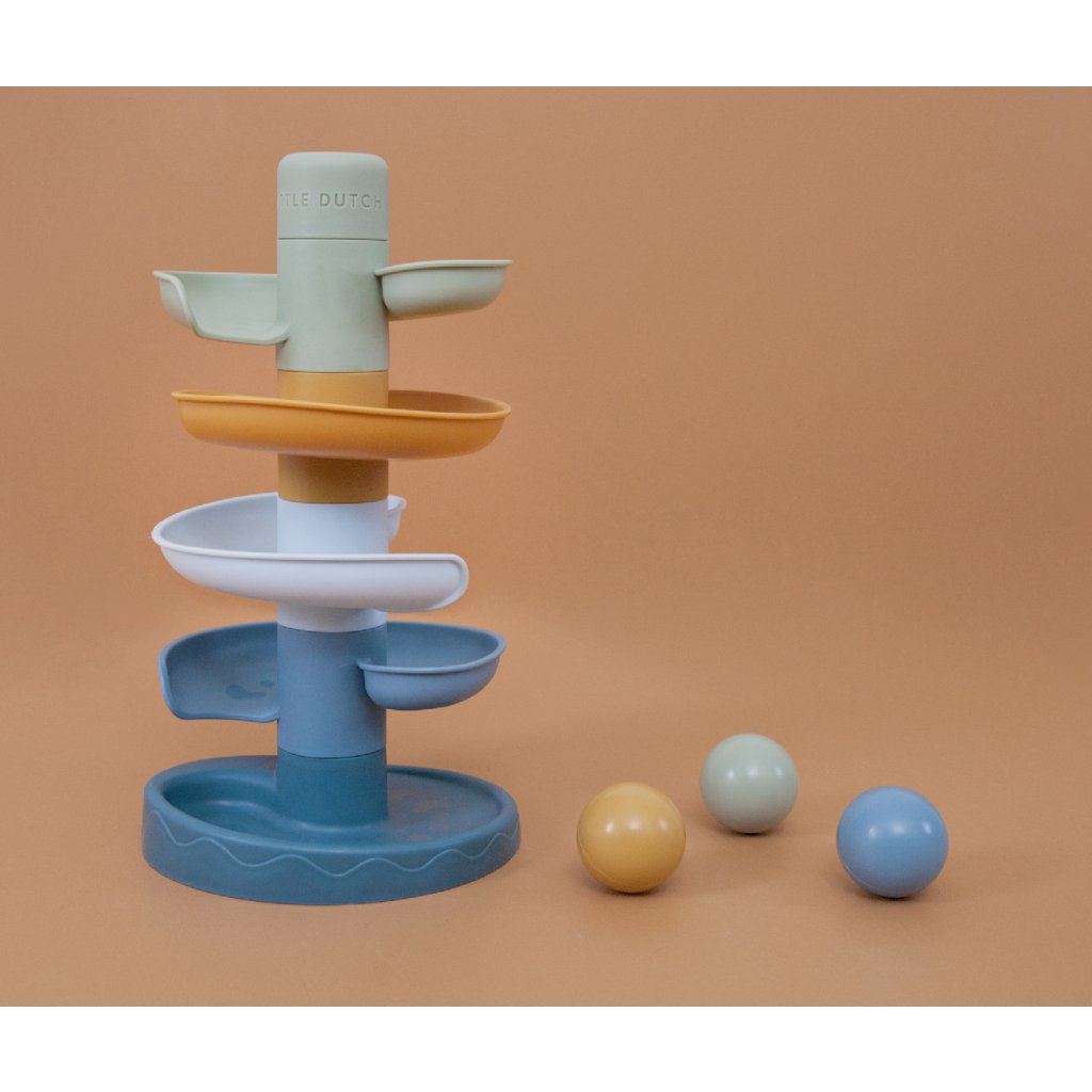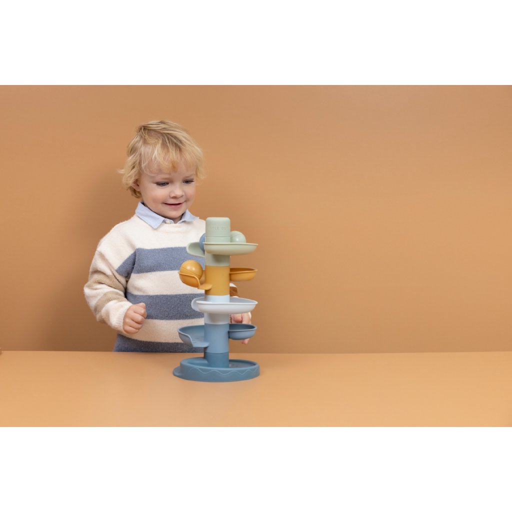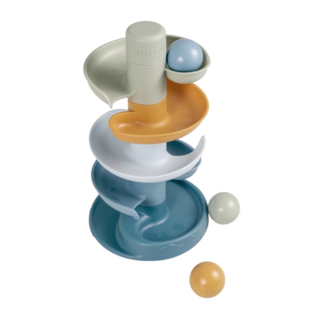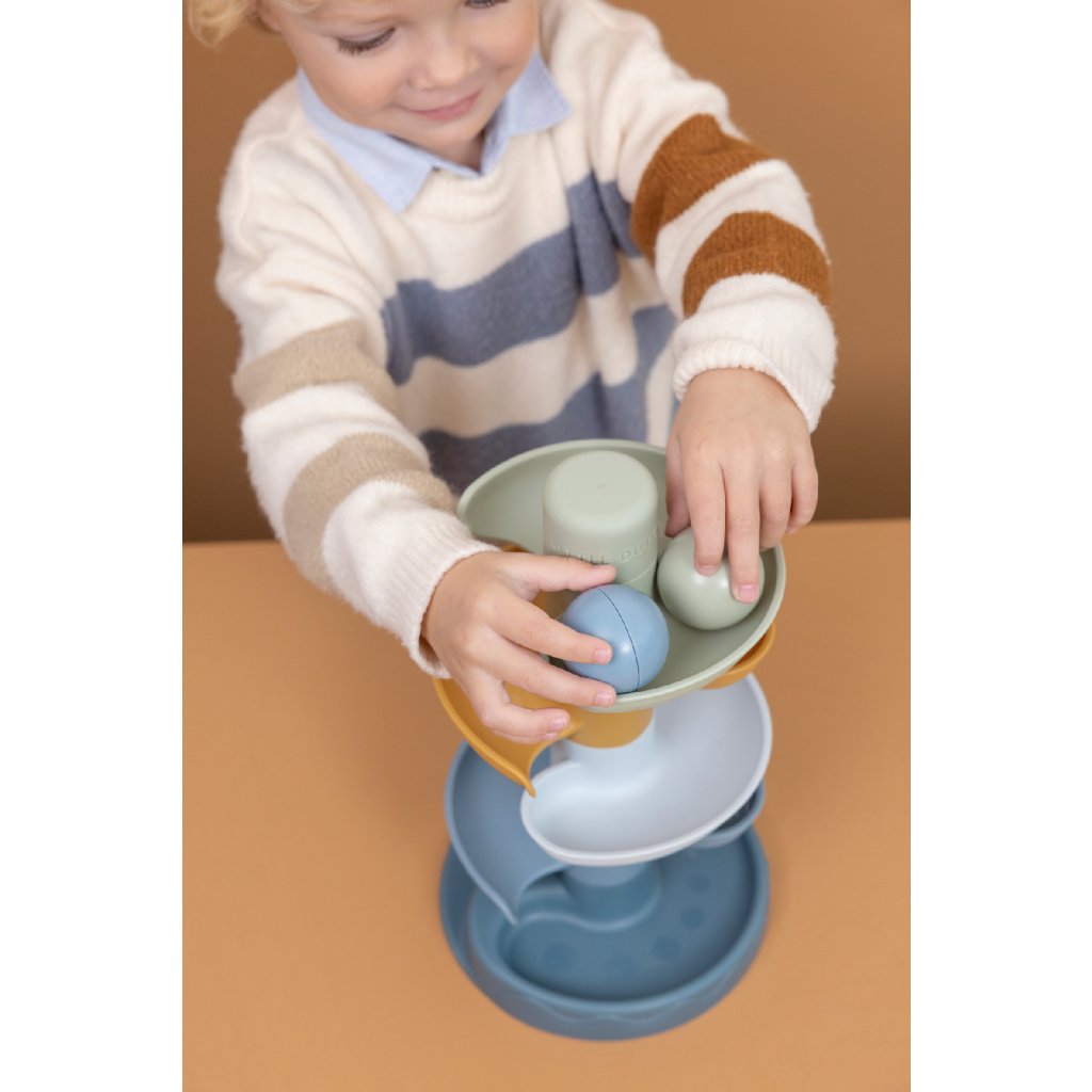 Sledujte s vašim dieťaťom, ako sa loptičky kotúľajú dookola jedna za druhou! Dráhu v jemných pastelových farbách ľahko zostavíte z piatich dielov a zábava môže začať.