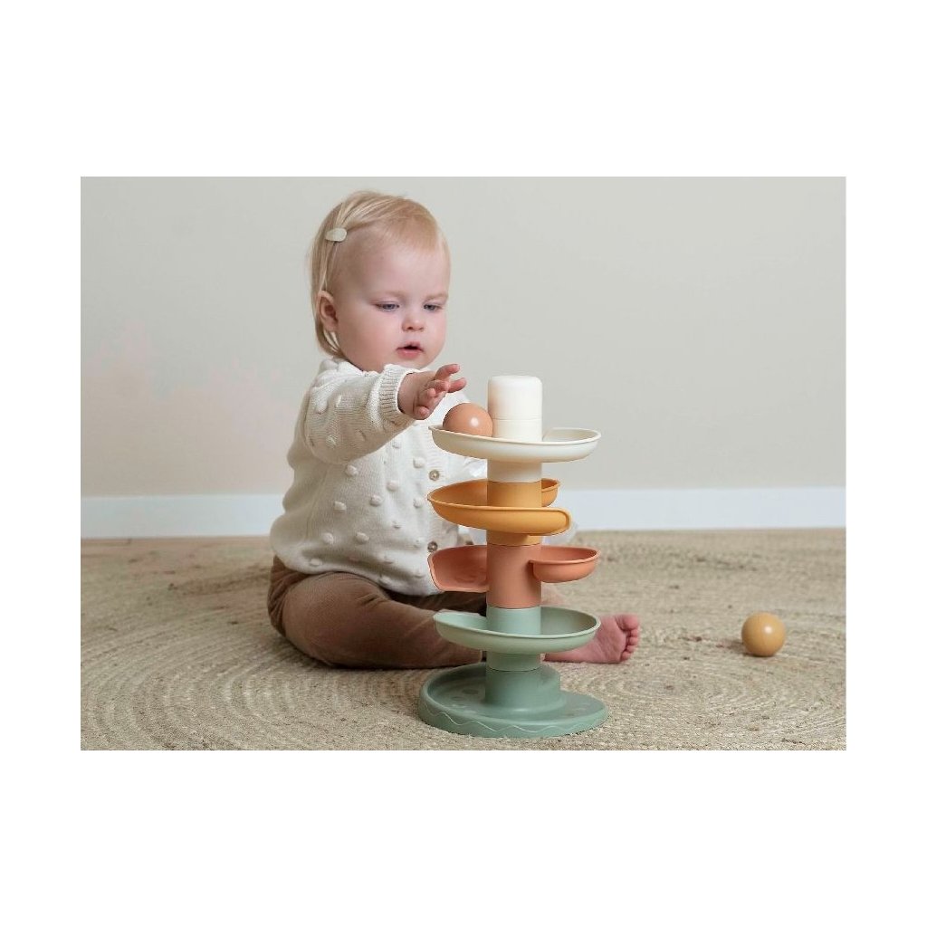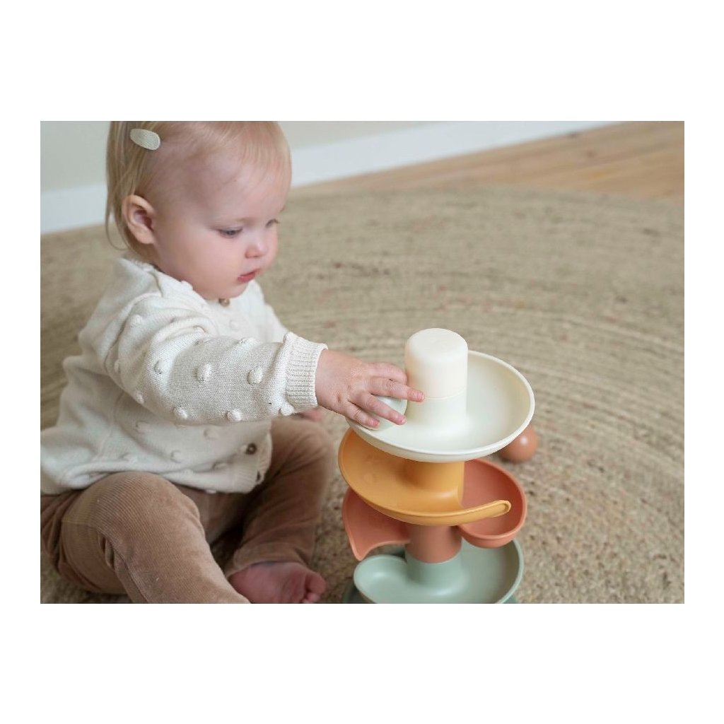 Sledujte s vašim dieťaťom, ako sa guľôčky kotúľajú dookola jedna za druhou! Dráhu v jemných pastelových farbách ľahko zostavíte z piatich dielov a zábava môže začať.