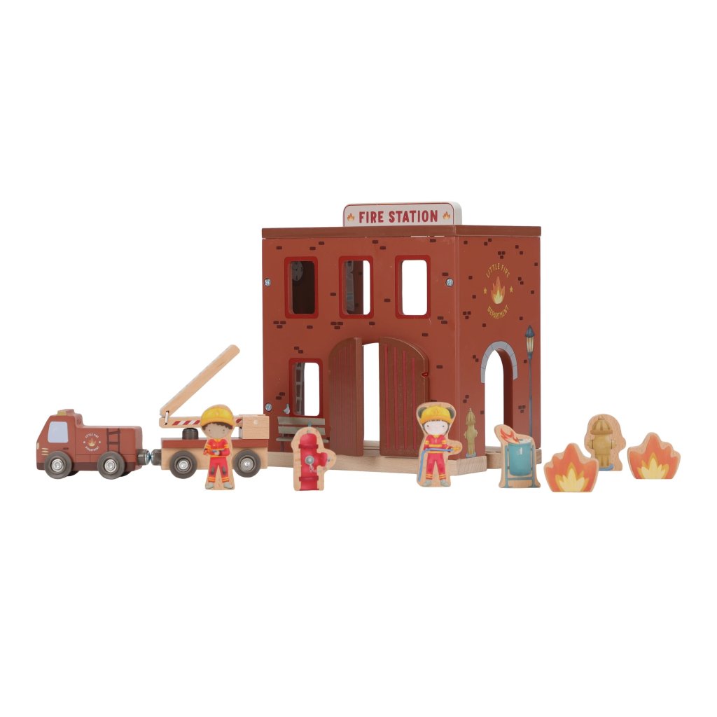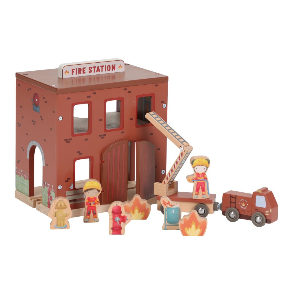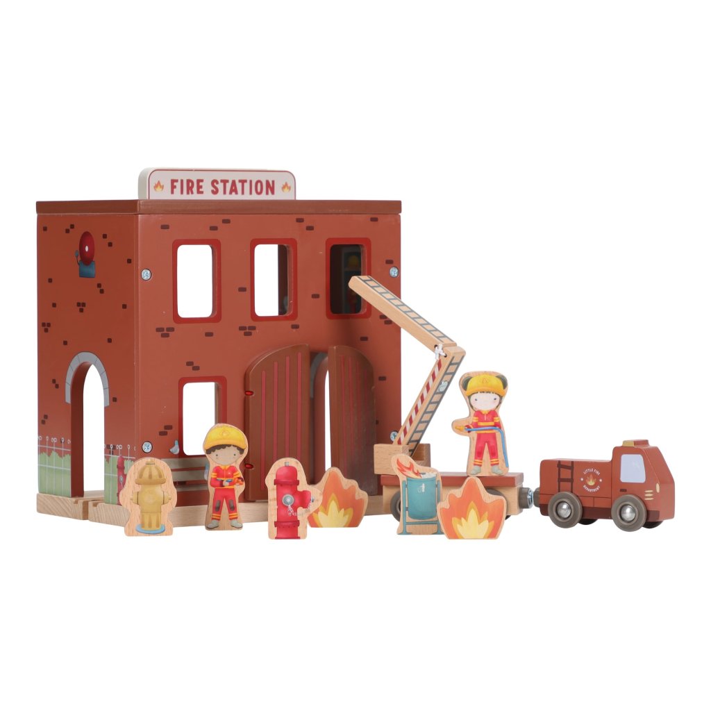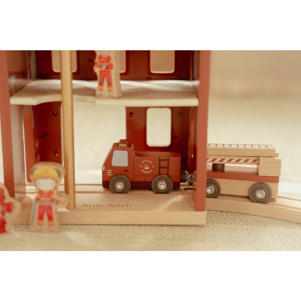 Súčasťou sady sú figúrky hasičov, oheň a horiace popolnice pre realistické hranie. Dvere stanice je možné otvoriť, aby mohol zásah začať čo najrýchlejšie. Hasičská stanica je kompatibilná s drevenou vláčikodráhou Little Dutch, čo umožňuje ešte viac zábavy a kombinácií.