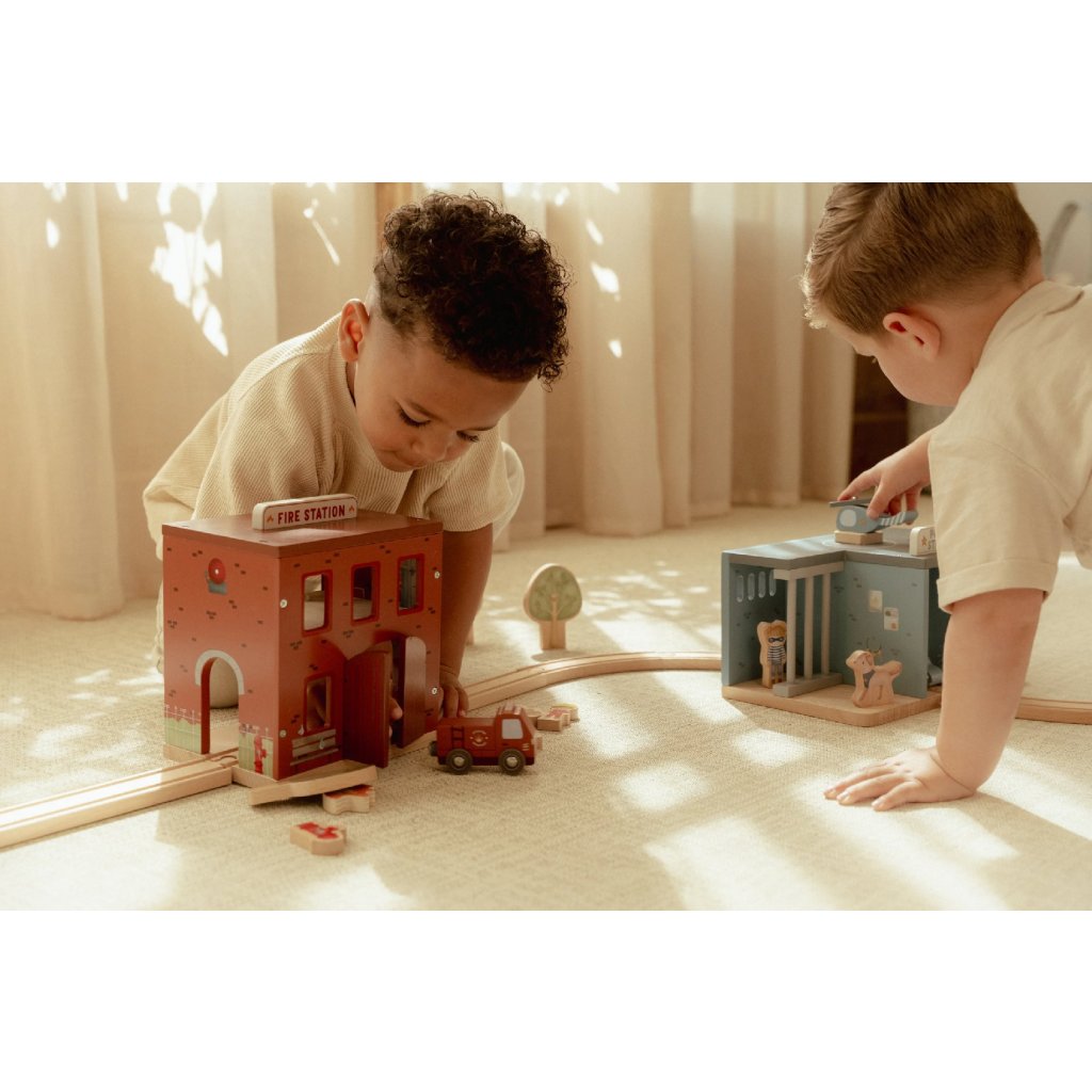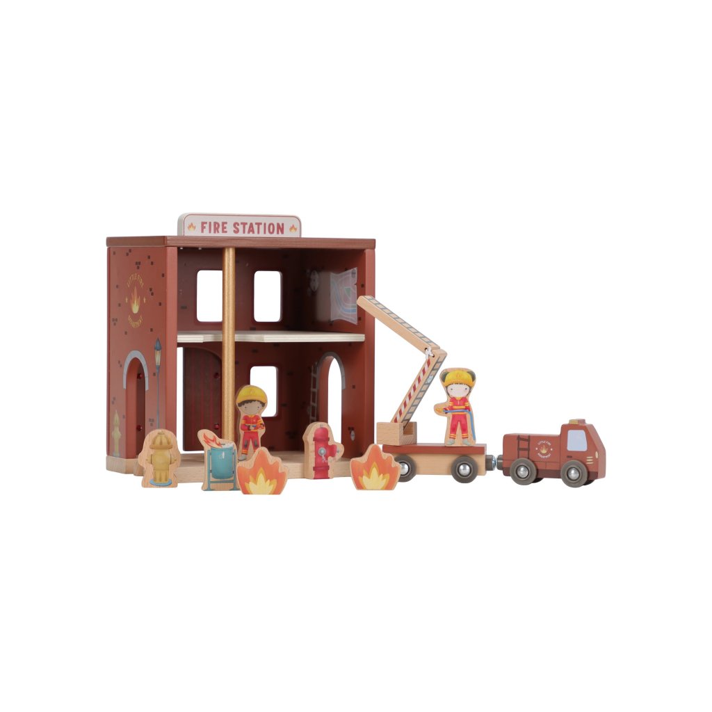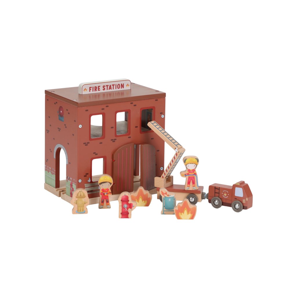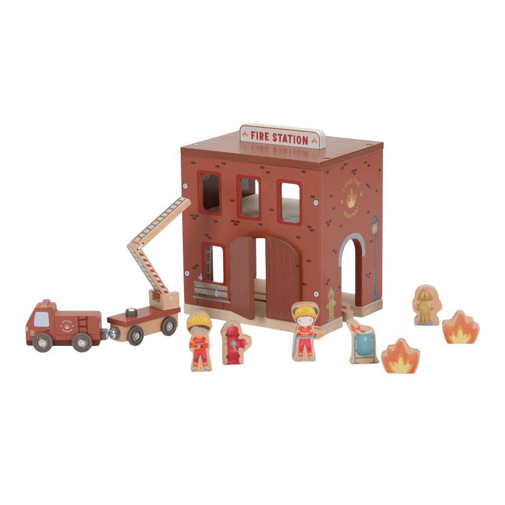 Súčasťou sady sú figúrky hasičov, oheň a horiace popolnice pre realistické hranie. Dvere stanice je možné otvoriť, aby mohol zásah začať čo najrýchlejšie. Hasičská stanica je kompatibilná s drevenou vláčikodráhou Little Dutch, čo umožňuje ešte viac zábavy a kombinácií.