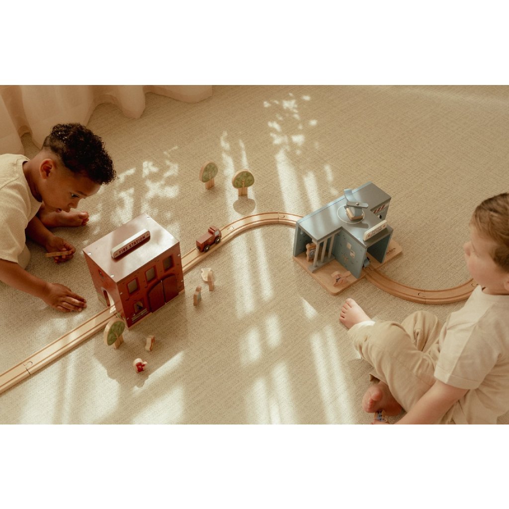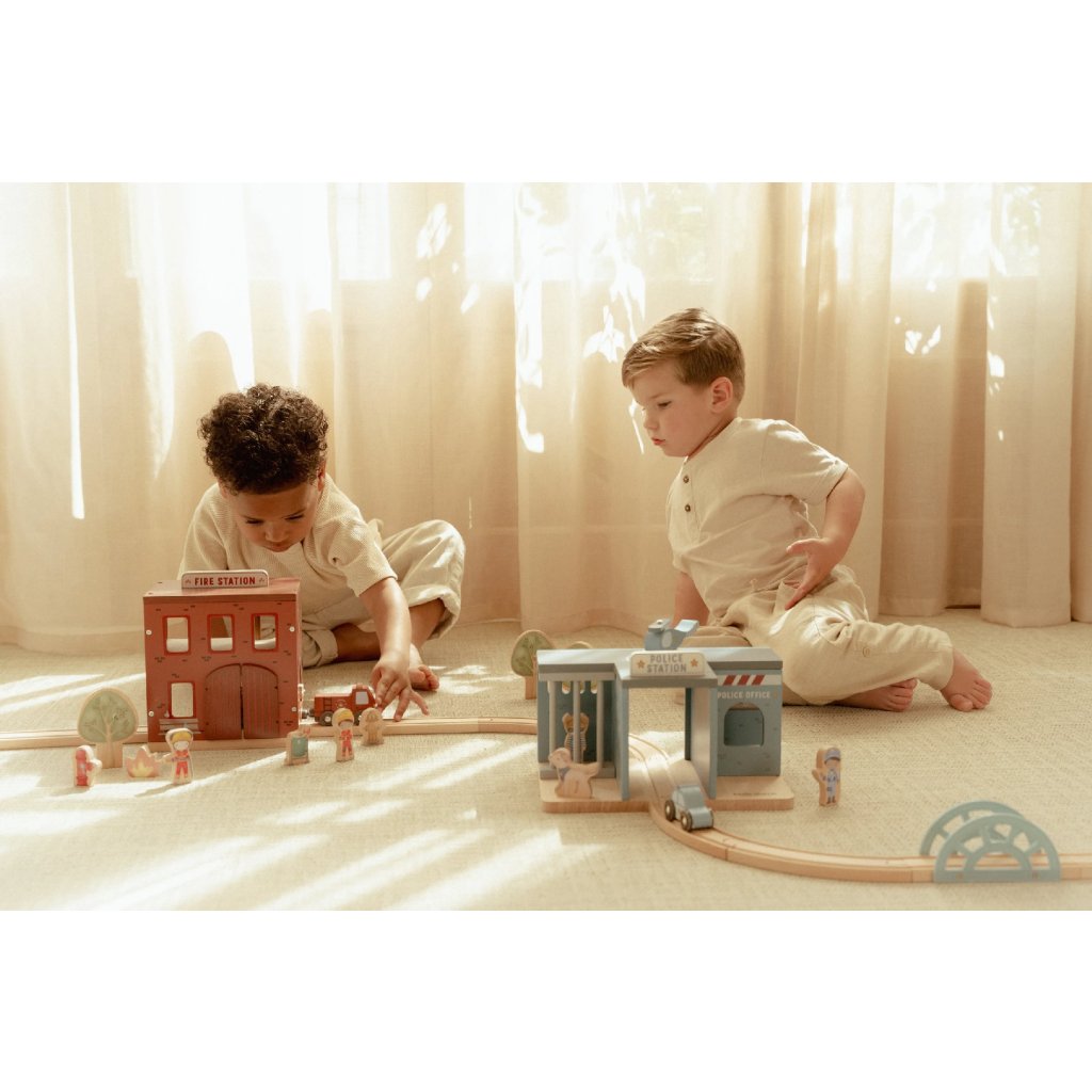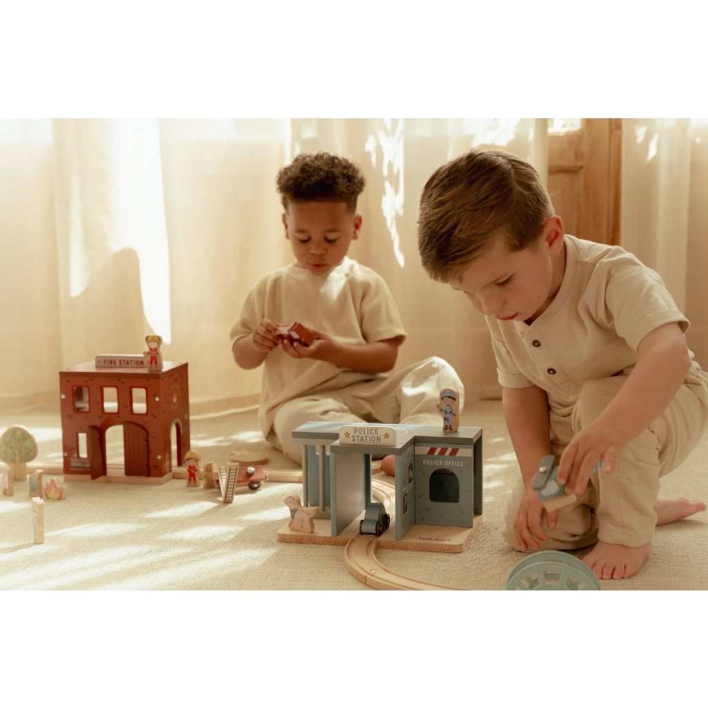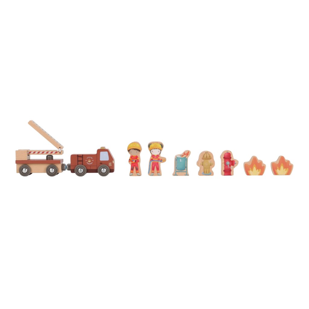Súčasťou sady sú figúrky hasičov, oheň a horiace popolnice pre realistické hranie. Dvere stanice je možné otvoriť, aby mohol zásah začať čo najrýchlejšie. Hasičská stanica je kompatibilná s drevenou vláčikodráhou Little Dutch, čo umožňuje ešte viac zábavy a kombinácií.