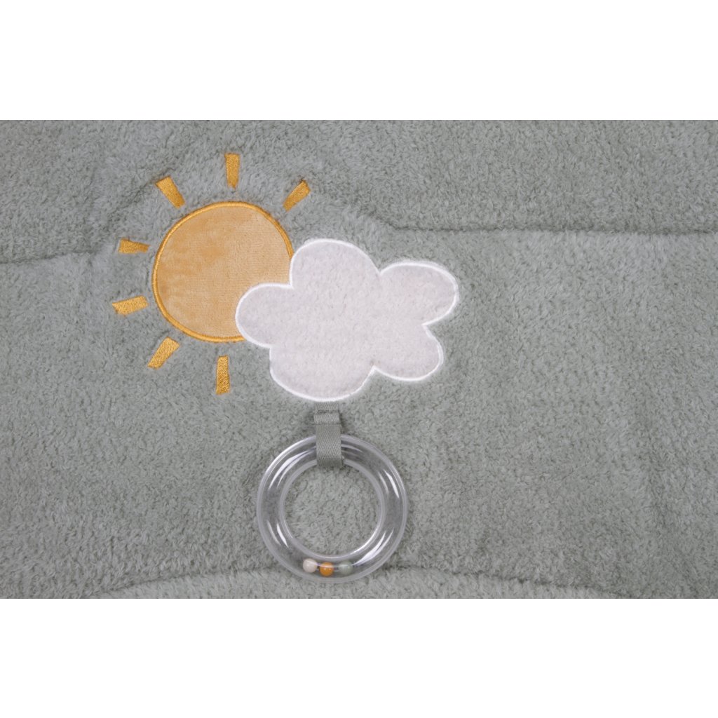 Mäkká hracia deka ponúka pohodlie a rôznorodé aktivity na zabavenie vášho dieťaťa. Na deke nájdete sliepočku s bezpečným zrkadlom schovaným pod krídlom, kuriatko, včielku so šuštiacimi krídlami i mráčiky s hrkajúcimi krúžkami a hryzátkom.