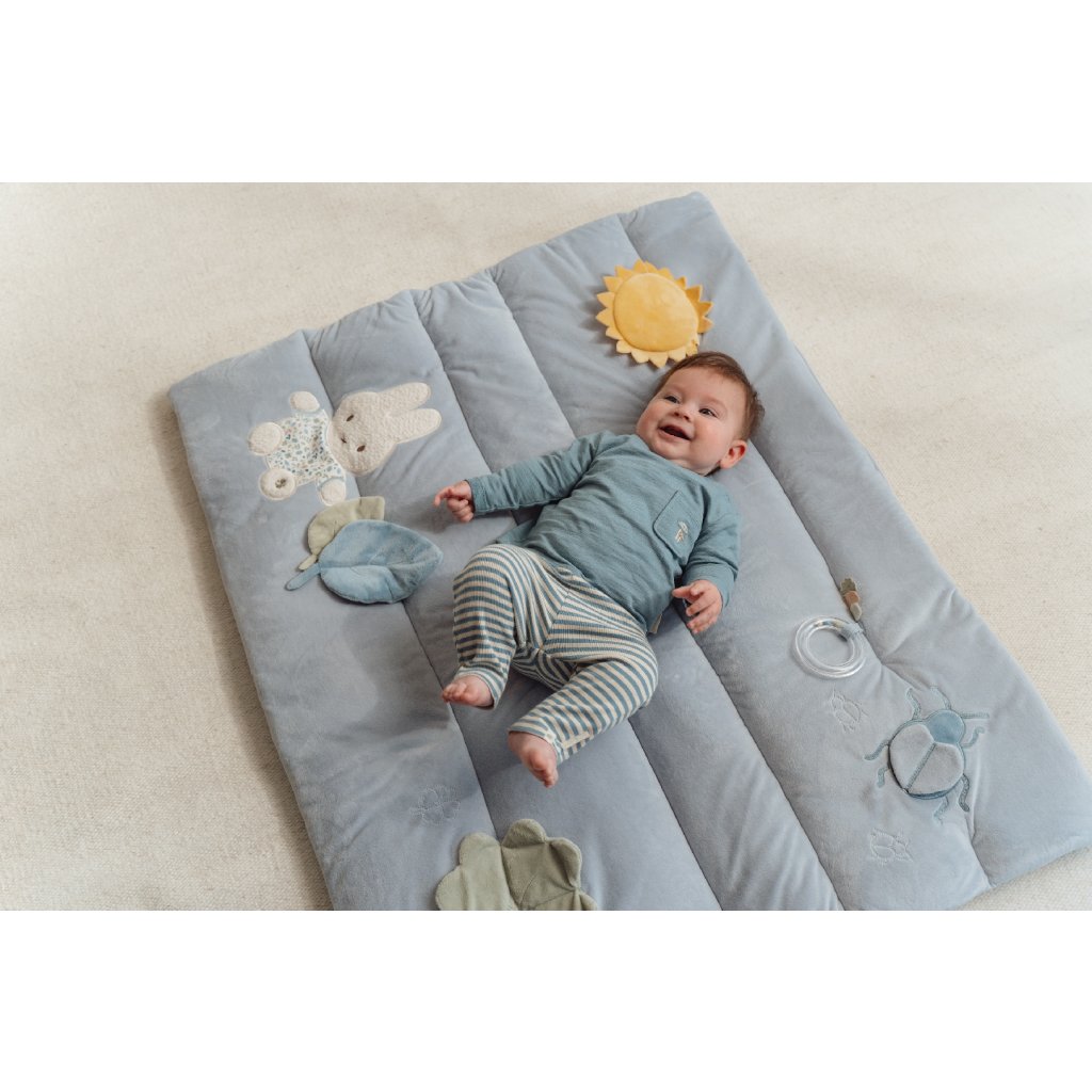 Mäkká hracia deka ponúka pohodlie a rôznorodé aktivity na zabavenie vášho dieťaťa. Na deke nájdete plyšové králičie dievčatko Miffy, slniečko s bezpečným zrkadlom, lístky, štvorlístok so šuštiacimi lístkami, plyšového chrobáčika i chrastiaci krúžok.