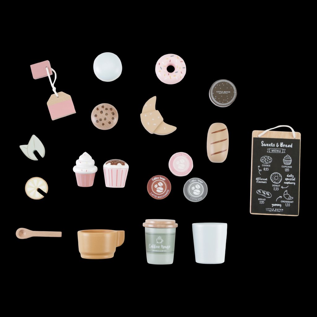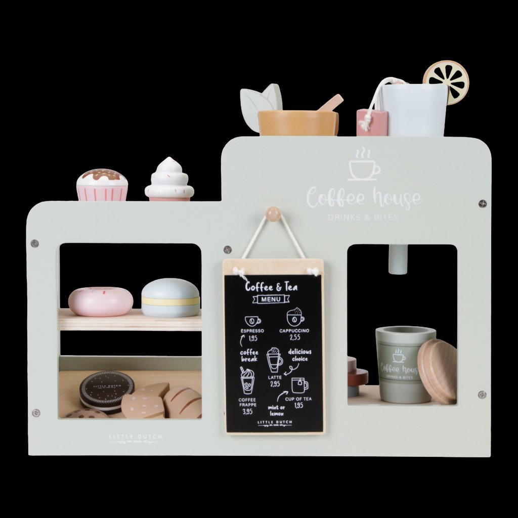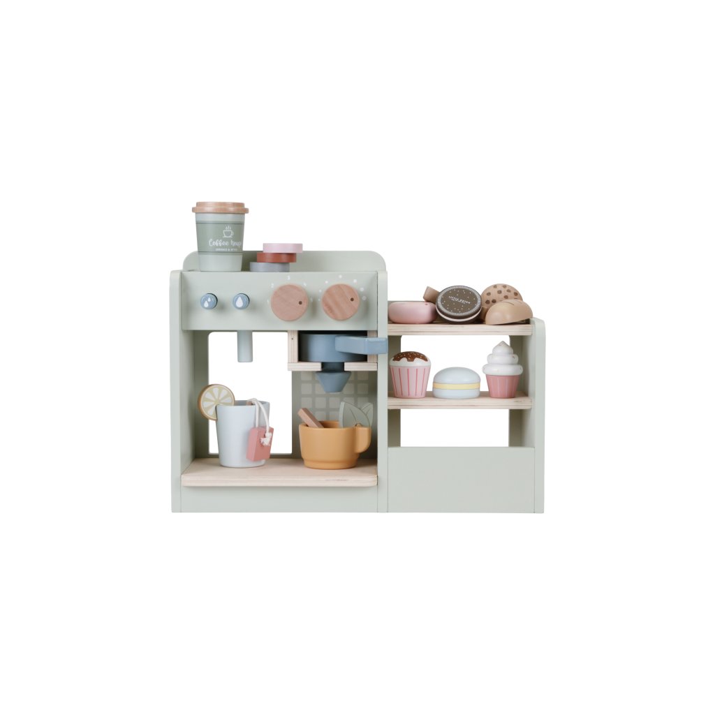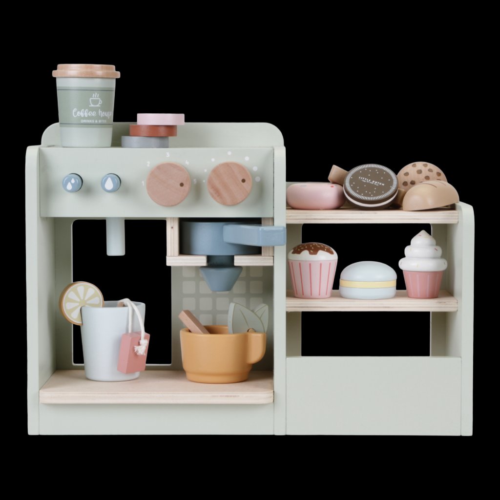 Dáte si kávu alebo čaj? S týmto dreveným kávovarom s bohatým príslušenstvom si môže vaše dieťa otvoriť doma vlastnú kaviareň a pozvať vás na cappuccino či espresso spolu s tortou, koláčikom či sendvičom. Na prípravu kávy stačí otočiť gombíkom, stlačiť tlačidlo a káva je hotová! Poličky s vystavenými zákuskami lákajú na ochutnanie, nápojový lístok vám uľahčí objednávanie nápojov.