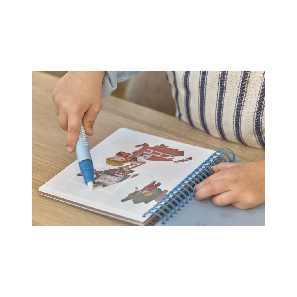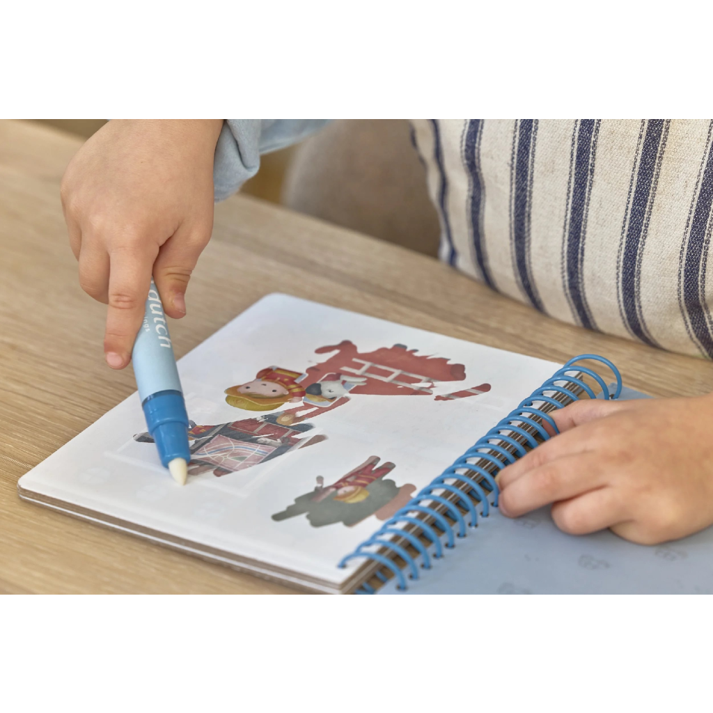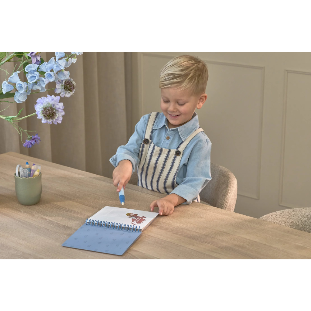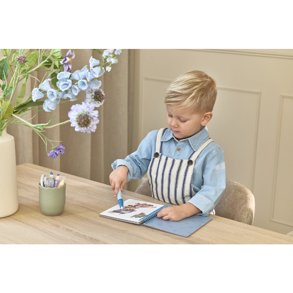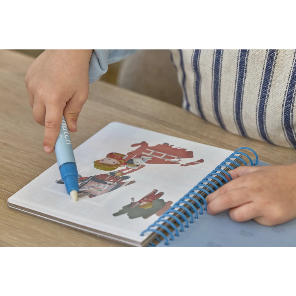 Knižka s piatimi ilustrovanými stránkami je opakovane použiteľná. Vďaka krúžkovej väzbe z pevného kartónu drží otvorená na pohodlné maľovanie.