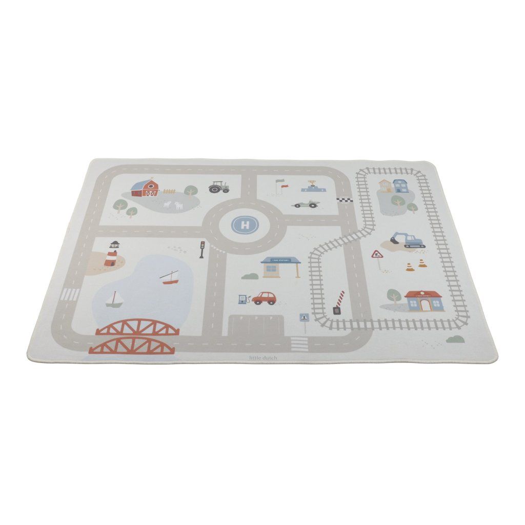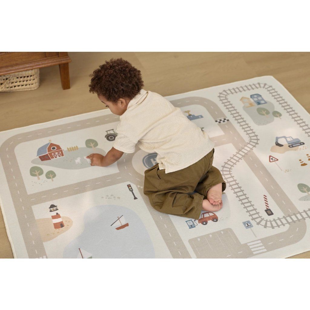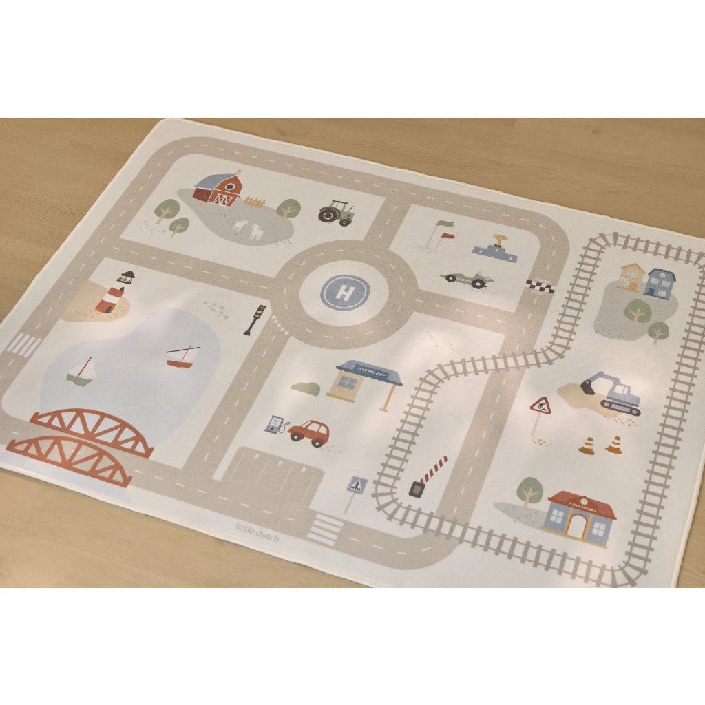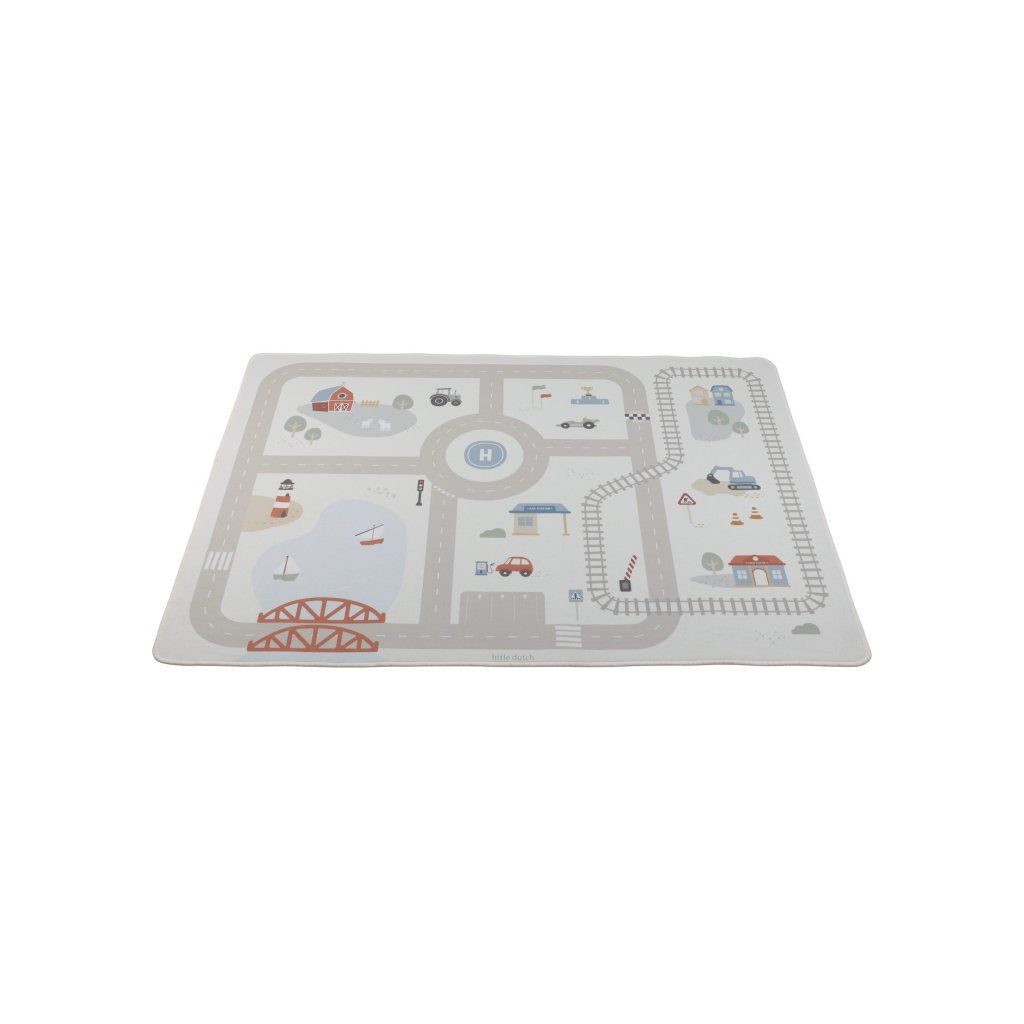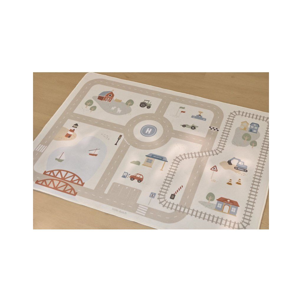 Detský koberec Little Dutch premení podlahu v detskej izbe na živý svet plný ciest, zákrut a križovatiek, kde sa príbehy tvoria samé. Deti môžu parkovať autá do garáže, prechádzať mestom alebo sa vydať na cestu vlakom – dizajn koberca ich prirodzene vedie a podporuje fantáziu aj sústredenú hru. Koberec bude skvelým doplnkom pri hraní s autíčkami, vláčikmi, stavebnicami alebo ďalšími hračkami.