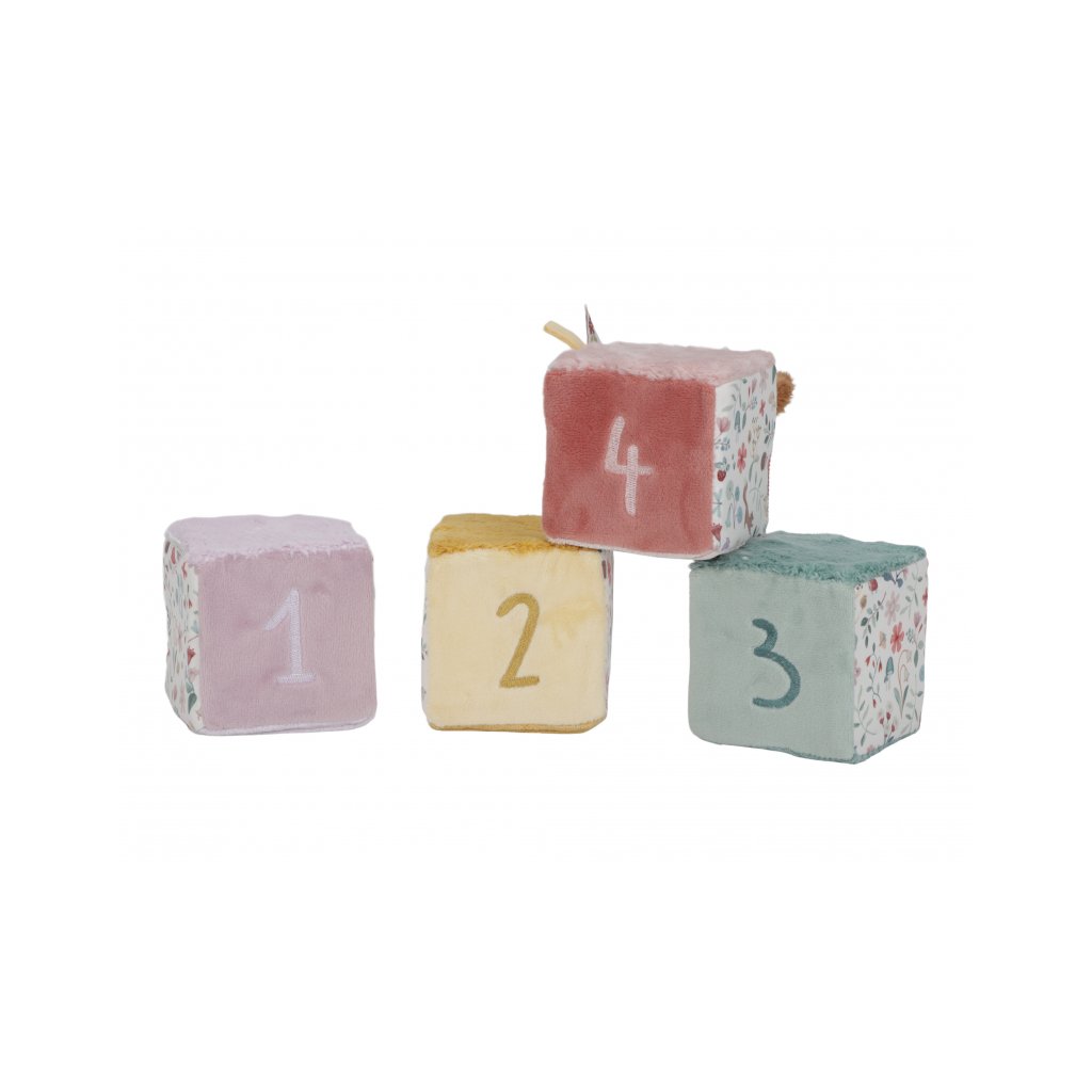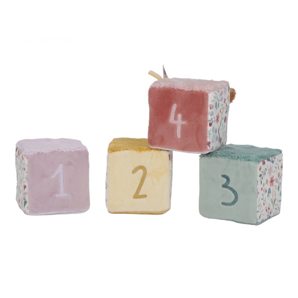 Mäkké textilné kocky s krásnymi motívmi zo života na záhrade sú vďaka svojmu prevedeniu ľahko uchopiteľné malými detskými ručičkami. Rôznorodé textúry a vzory lákajú dieťa na skúmanie, kocky navyše pri pohybe jemne cinkajú a hrkajú.