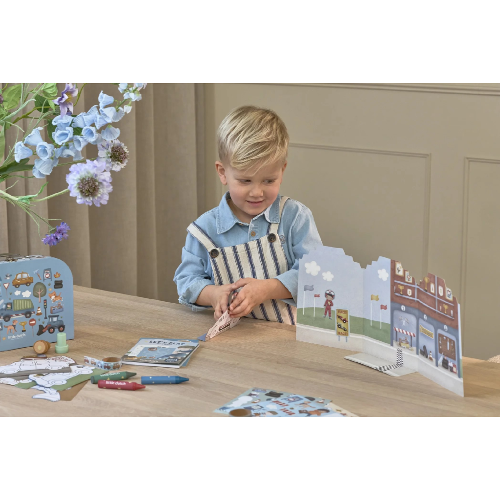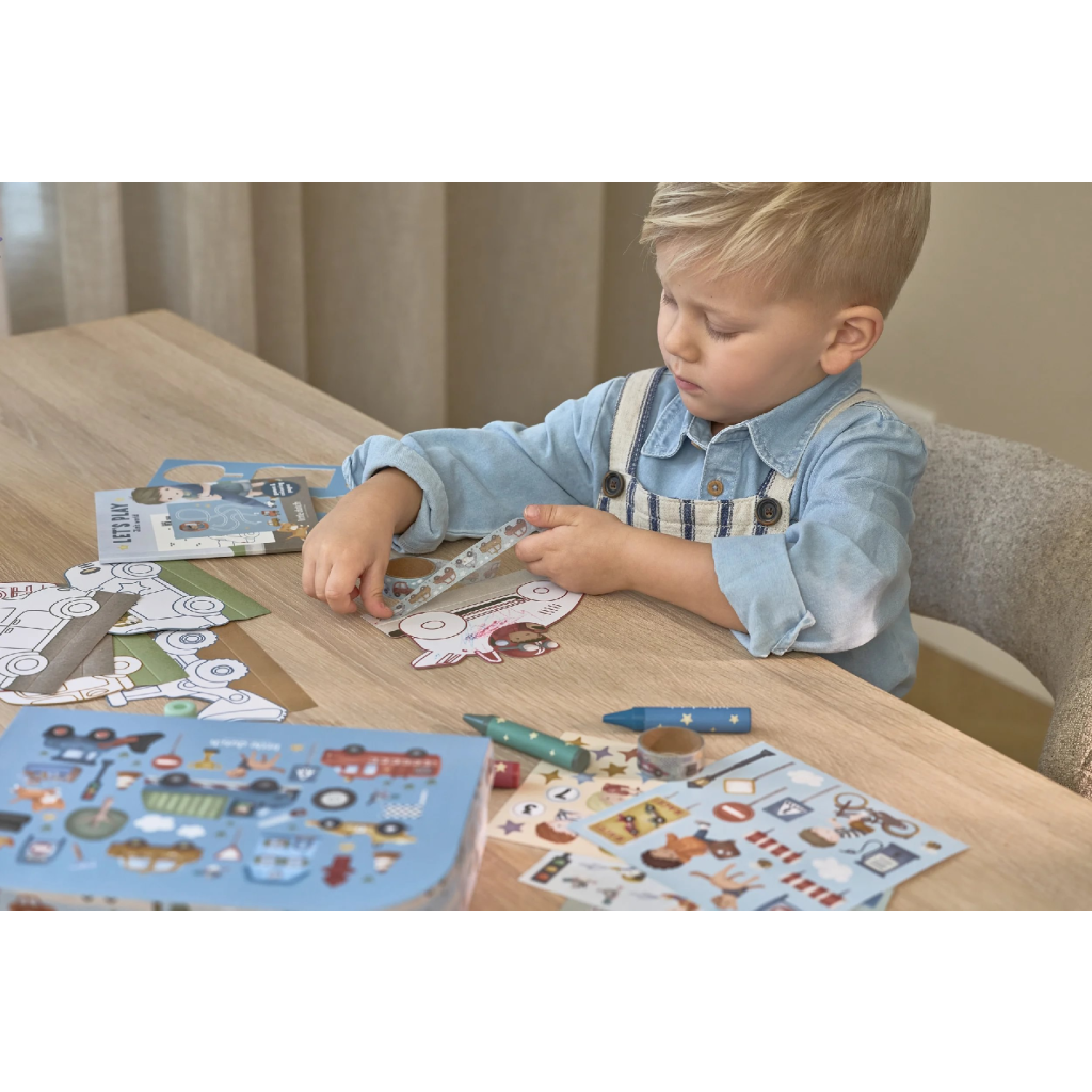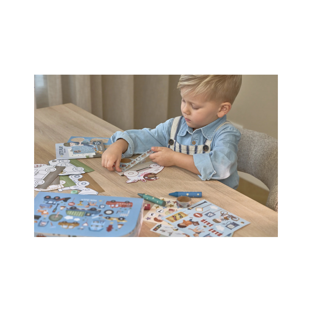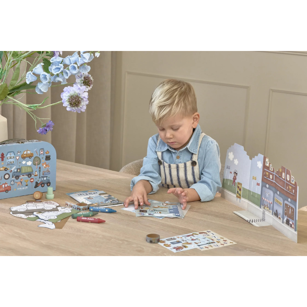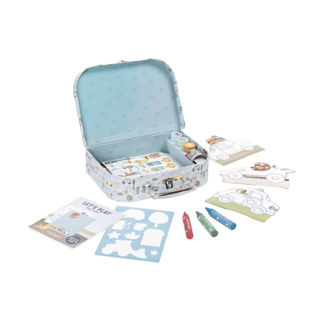 Veľká kreatívna súprava obsahuje potreby pre rôzne druhy výtvarného tvorenia vrátane pasteliek, samolepiek, pečiatok a pod. Motívy zo života v meste, rôzne dopravné prostriedky a profesie, to všetko nabáda k vymýšľaniu príbehov a kreatívnemu tvoreniu. Všetko je zabalené v krásnom kufríku, do ktorého všetko po skončení hry ľahko upracete.