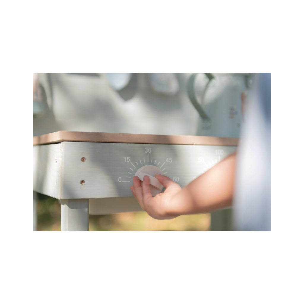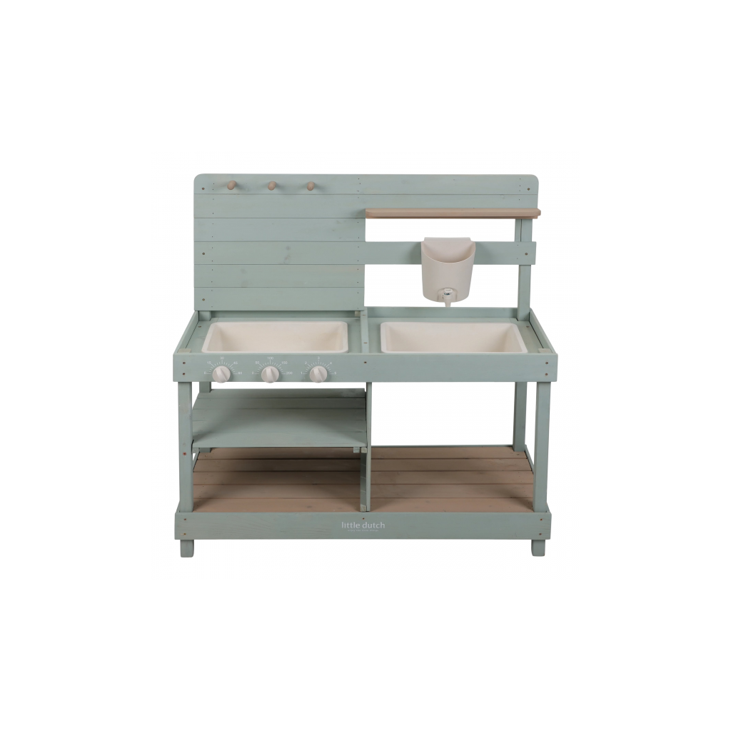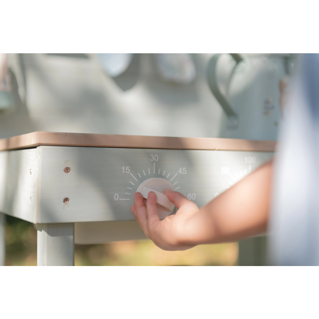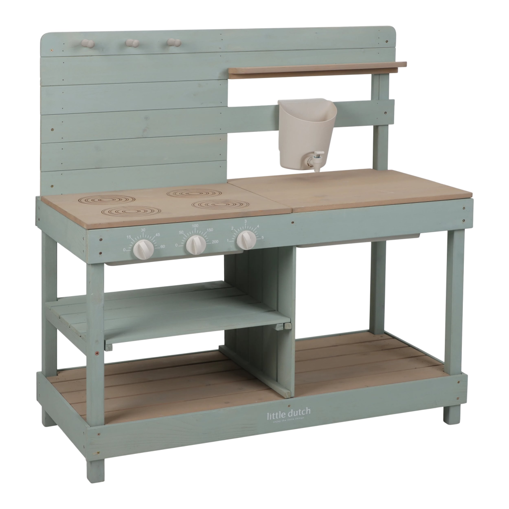 Drevená vonkajšia kuchynka je ideálna hračka na záhradu pre malých záhradníkov i malých kuchárov, ktorí milujú tvorenie z piesku, vody a blata. Kuchynka so sporákom má otočné gombíky, dva drezy a dokonca funkčný kohútik s nádržkou na vodu, takže si dieťa môže samo pustiť vodu a doplniť suroviny na „varenie“ vonku. Praktický detail sú tiež dve veľké vaničky schované pod odklopnými doskami, ktoré sú ako stvorené na hranie s vodou.