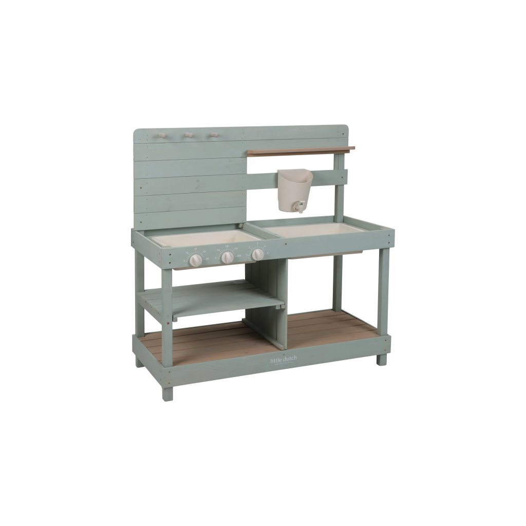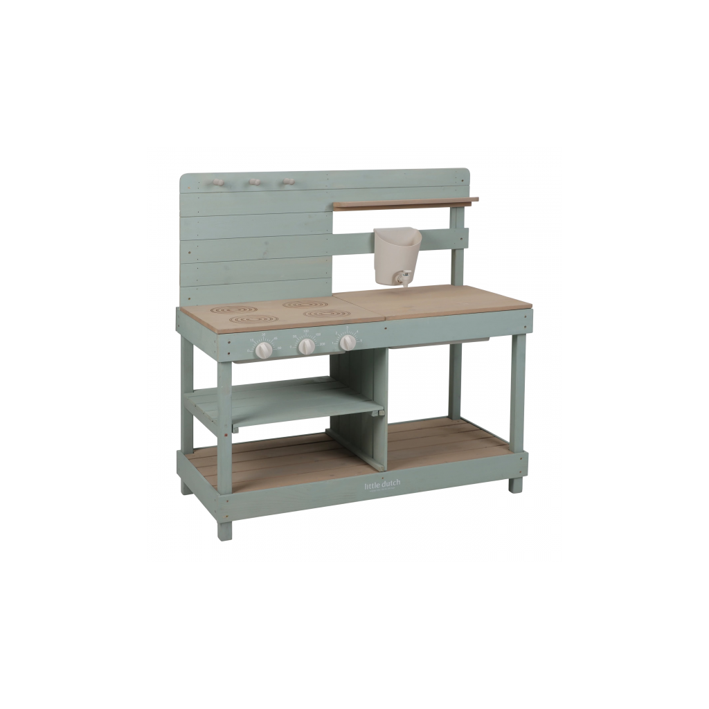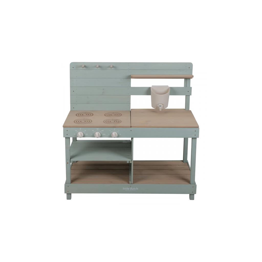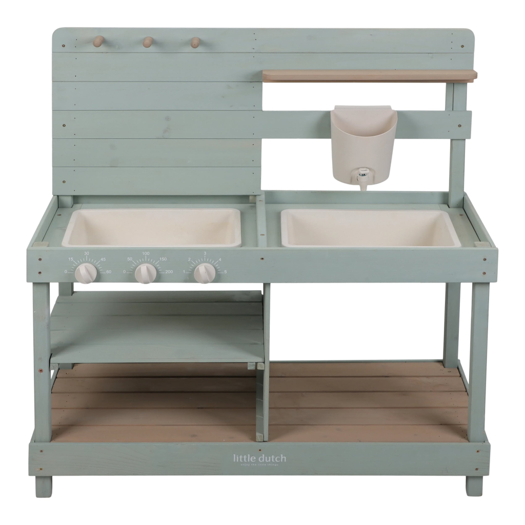 Drevená vonkajšia kuchynka je ideálna hračka na záhradu pre malých záhradníkov i malých kuchárov, ktorí milujú tvorenie z piesku, vody a blata. Kuchynka so sporákom má otočné gombíky, dva drezy a dokonca funkčný kohútik s nádržkou na vodu, takže si dieťa môže samo pustiť vodu a doplniť suroviny na „varenie“ vonku. Praktický detail sú tiež dve veľké vaničky schované pod odklopnými doskami, ktoré sú ako stvorené na hranie s vodou.