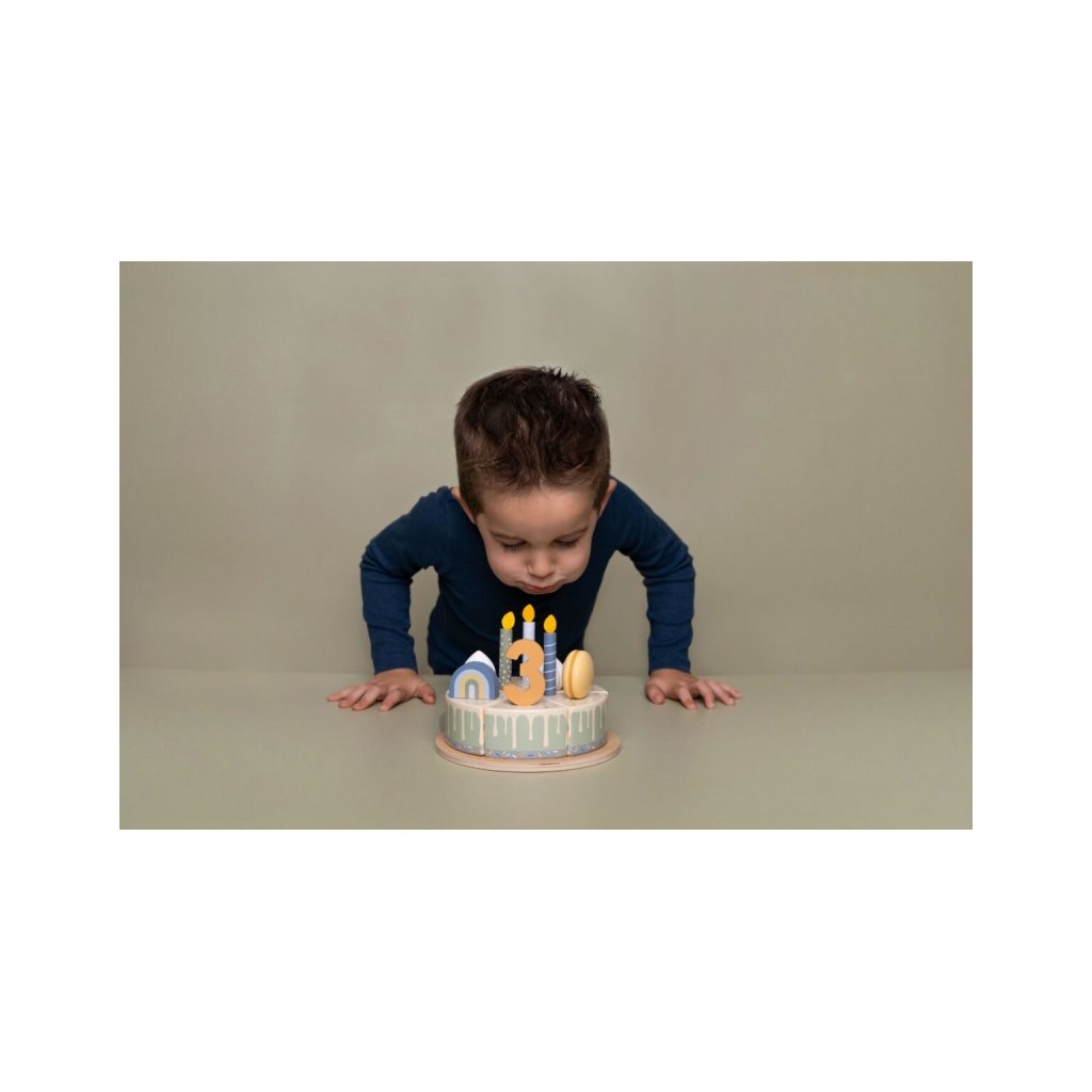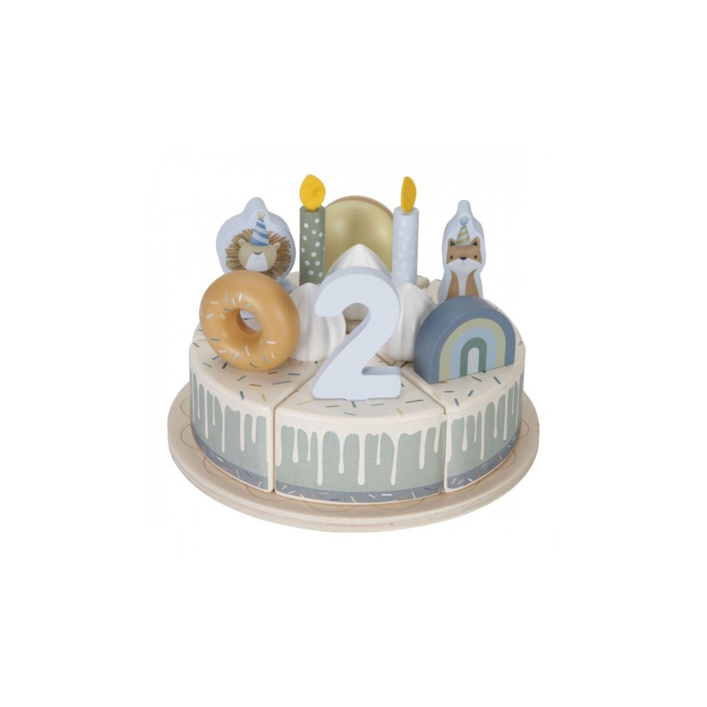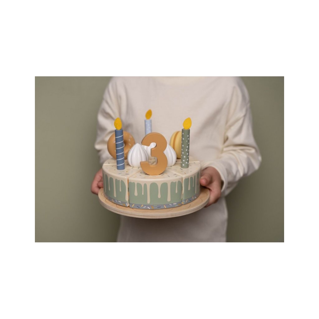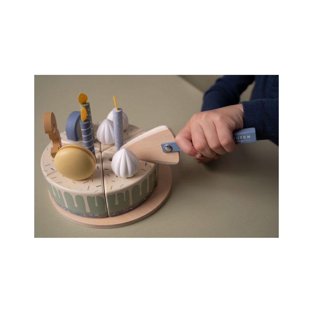 Sada s tortou v krásnom drevenom prevedení obsahuje 6 kúskov torty, 8 odnímateľných zdobení, 5 číslic, 5 sviečok, tanier na tortu a servírovaciu lopatku.
