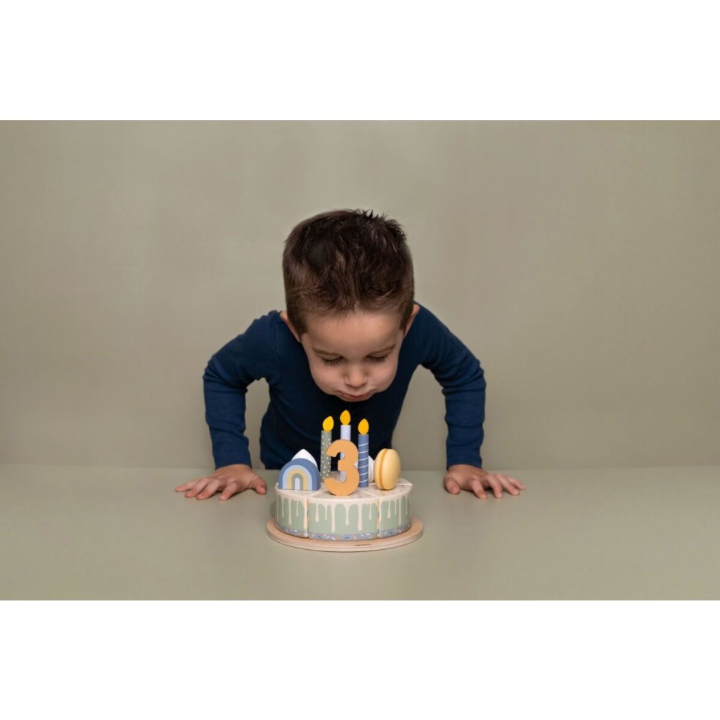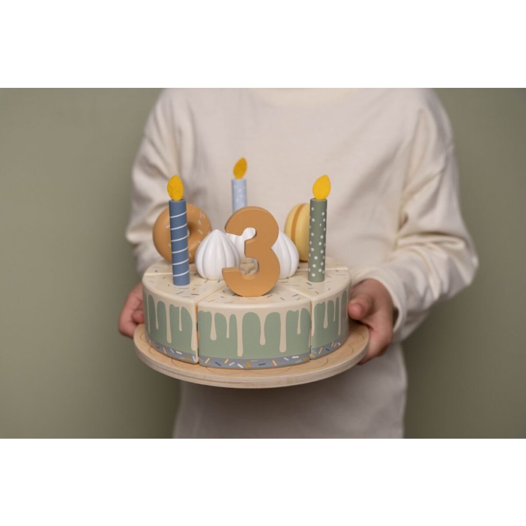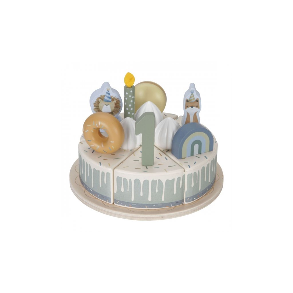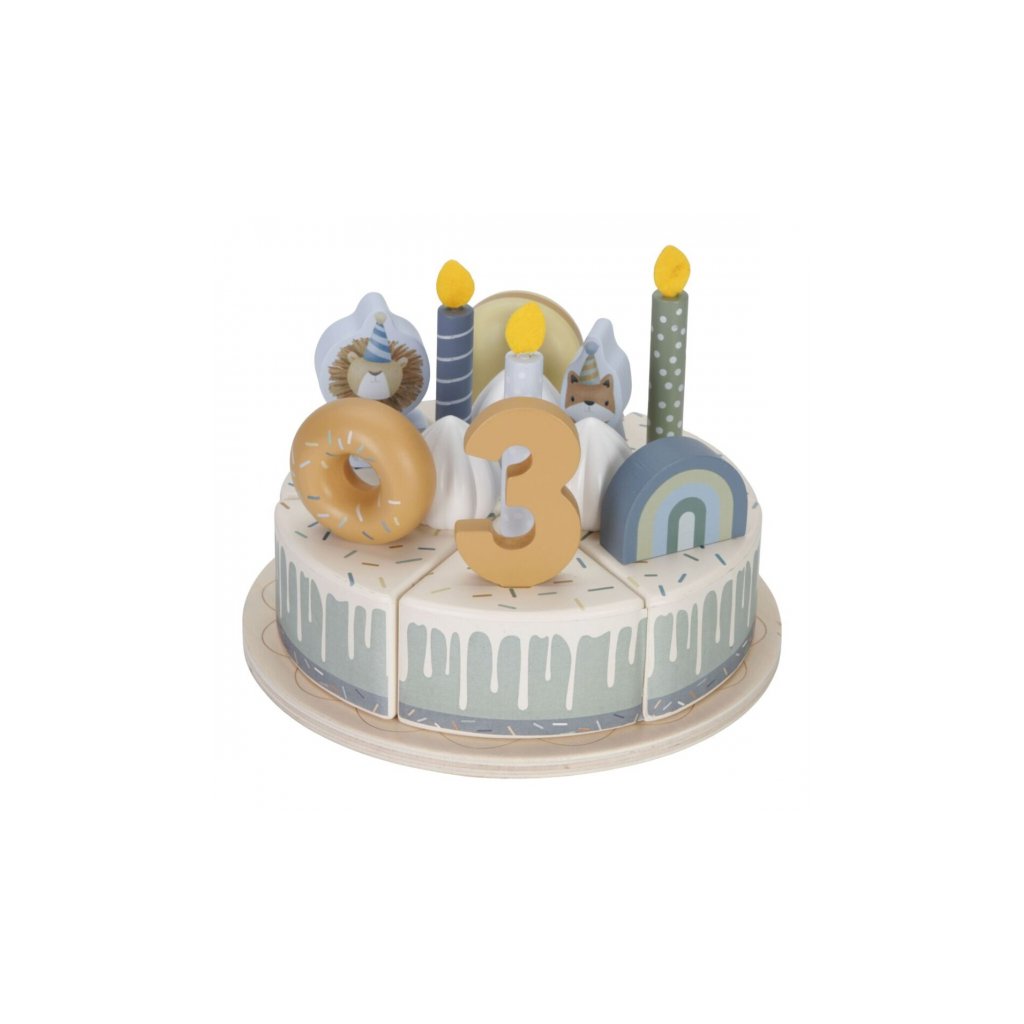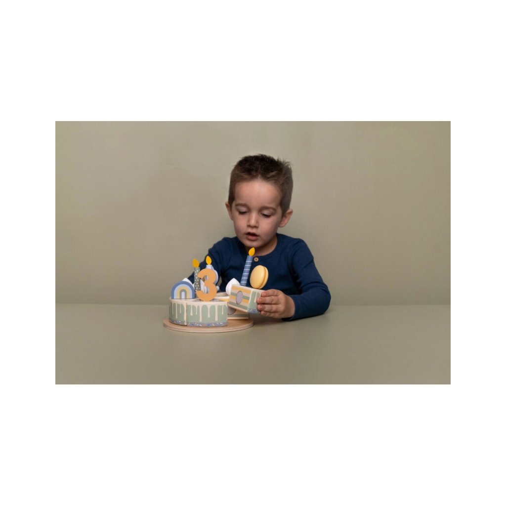 Sada s tortou v krásnom drevenom prevedení obsahuje 6 kúskov torty, 8 odnímateľných zdobení, 5 číslic, 5 sviečok, tanier na tortu a servírovaciu lopatku.